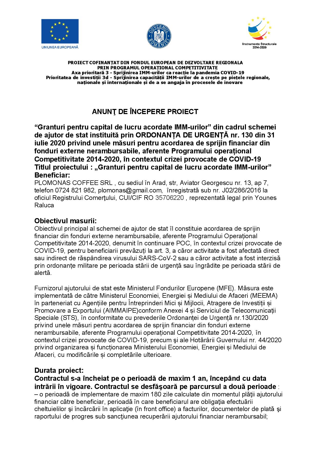 PLOMONAS COFFEE SRL , cu sediul în Arad, str, Aviator Georgescu nr. 13, ap 7, telefon 0724 821 982, plomonas@gmail.com, înregistrată sub nr. J02/286/2016 la oficiul Registrului Comerţului, CUI/CIF RO 35706220 , reprezentată legal prin Younes Raluca
