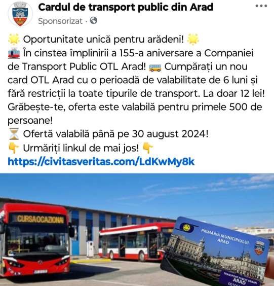 O tentativă de fraudă online în numele Companiei de Transport Public (CTP) Arad este în derulare pe reţeaua de socializare Facebook, unde este distribuită o reclamă care promite carduri de transport foarte ieftine şi în număr limitat, pentru a determina oamenii să completeze un formular prin care şi-ar putea dezvălui date personale sau financiare.