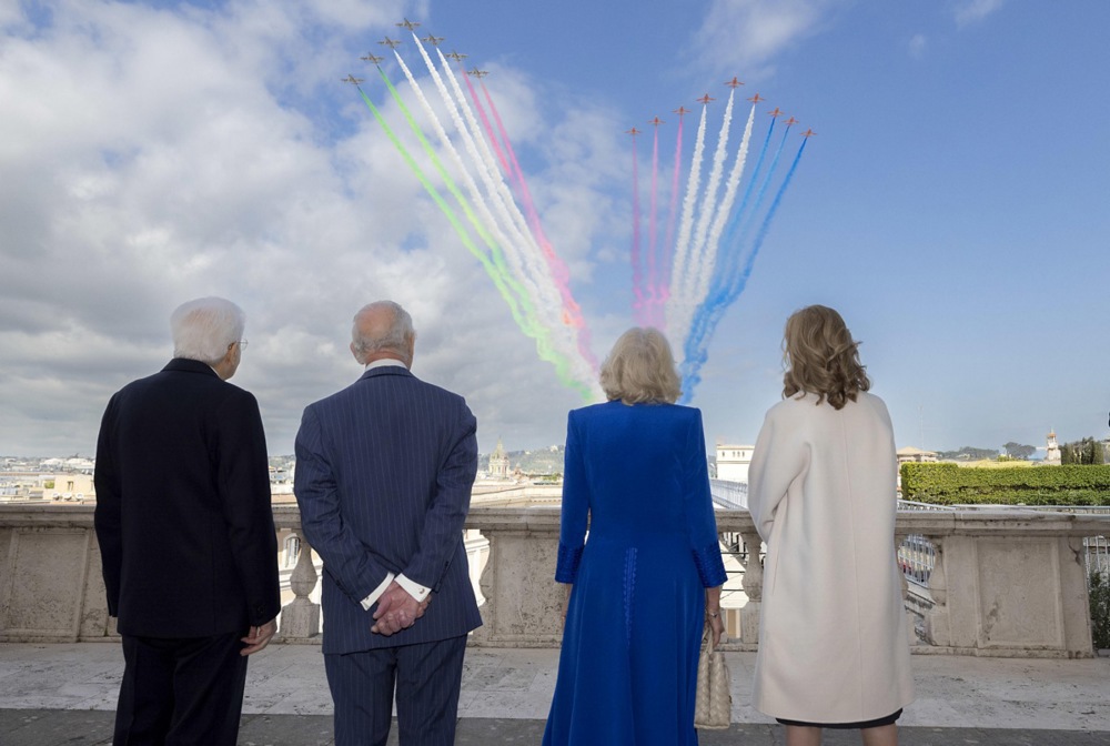 Apoi, regele și regina britanică au asistat alături de președintele Italiei la o paradă aeriană susținută de o escadrilă a Aviației italiene, ‘Frecce Tricolori’, și de echivalentul ei britanic, ‘Red Arrows’.