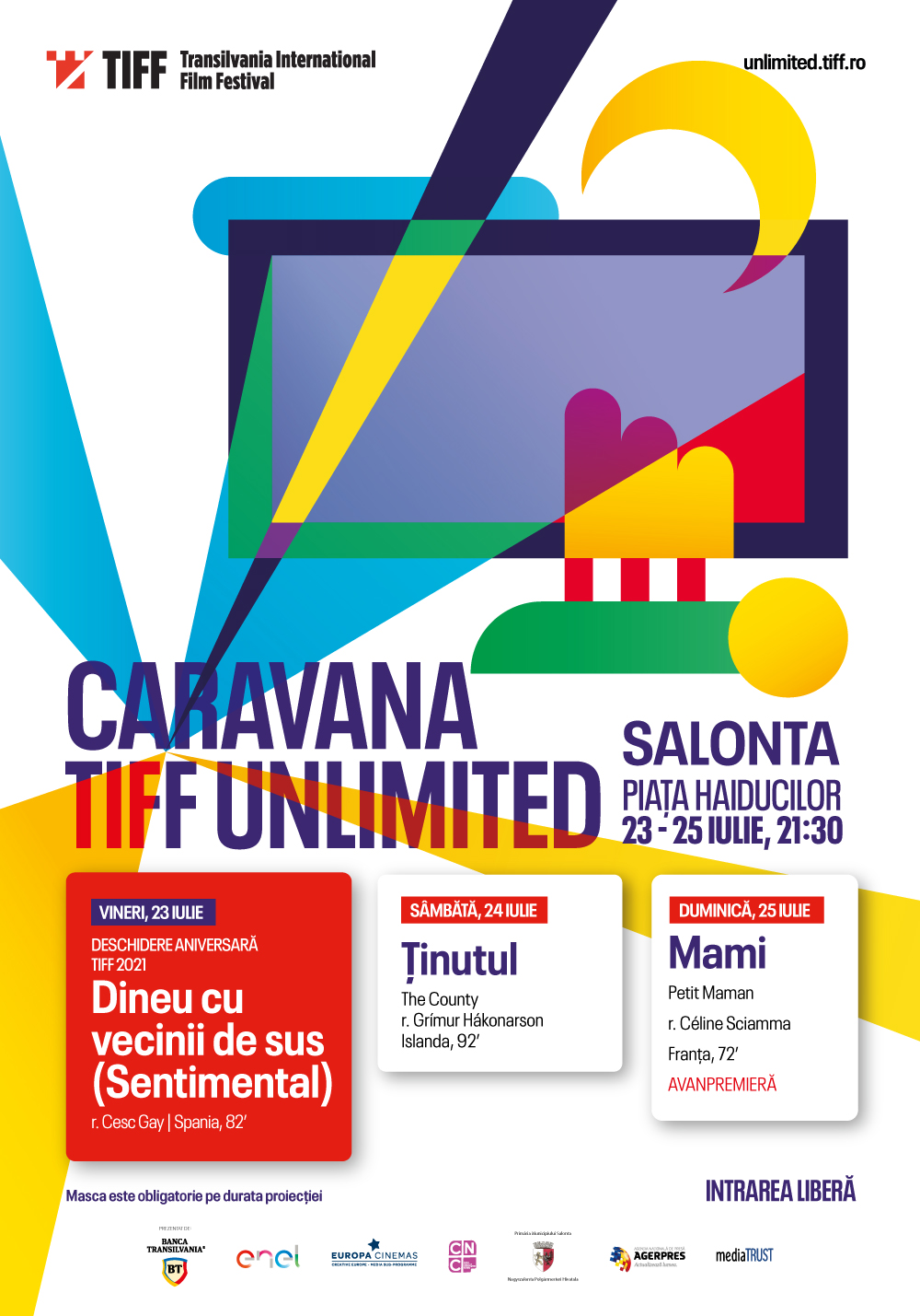 TIFF Unlimited(unlimited.tiff.ro) e cinema-ul alternativ de acasă, cu filme independente, premiate, semnate de cineaști care provoacă și te inspiră. Selecția include filme-reper de François Truffaut, David Lynch, Xavier Dolan, Abbas Kiarostami, Claude Chabrol, Stanley Donen, dar și titluri premiate la TIFF sau în alte mari festivaluri. Periodic, cinefilii au parte de surprize: parteneriate cu festivaluri, colecții de interviuri InspiraTIFF, premiere gratuite, teatru și gale live. Platforma e disponibilă online și în aplicațiile iOS și Android (mobile și TV) și poate fi accesată pe bază de abonament lunar sau anual, doar de pe teritoriul României.Proiectul Caravana TIFF. Caravana TIFF Unlimited este un proiect organizat în parteneriat cu TIFF și ajunge anul acesta la a 12-a ediție. Platforma de streaming a festivalului, TIFF Unlimited (unlimited.tiff.ro) a fost lansată în 2019 și cuprinde o selecție importantă de filme independente, premiate, semnate de cineaști de renume.