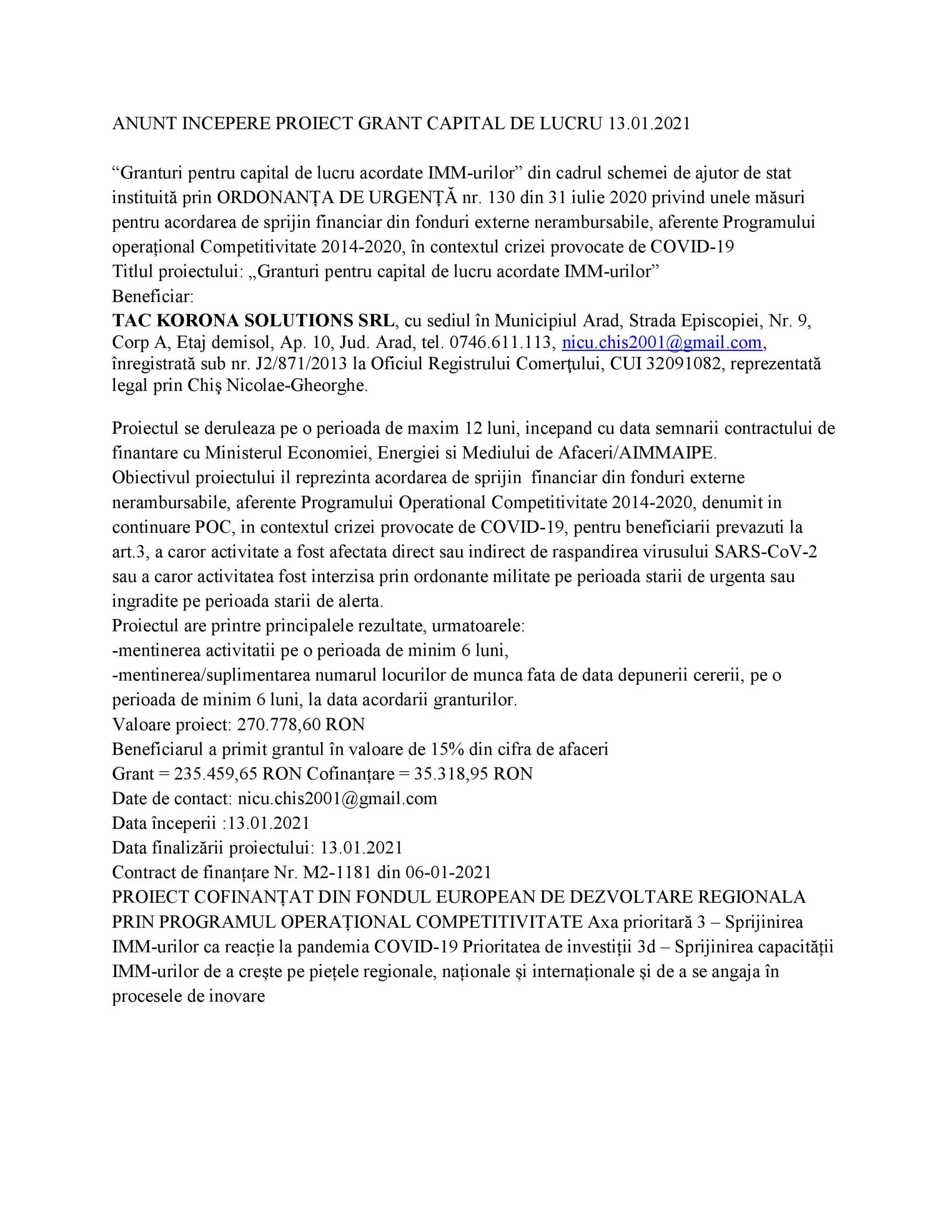Titlul proiectului: „Granturi pentru capital de lucru acordate IMM-urilor”