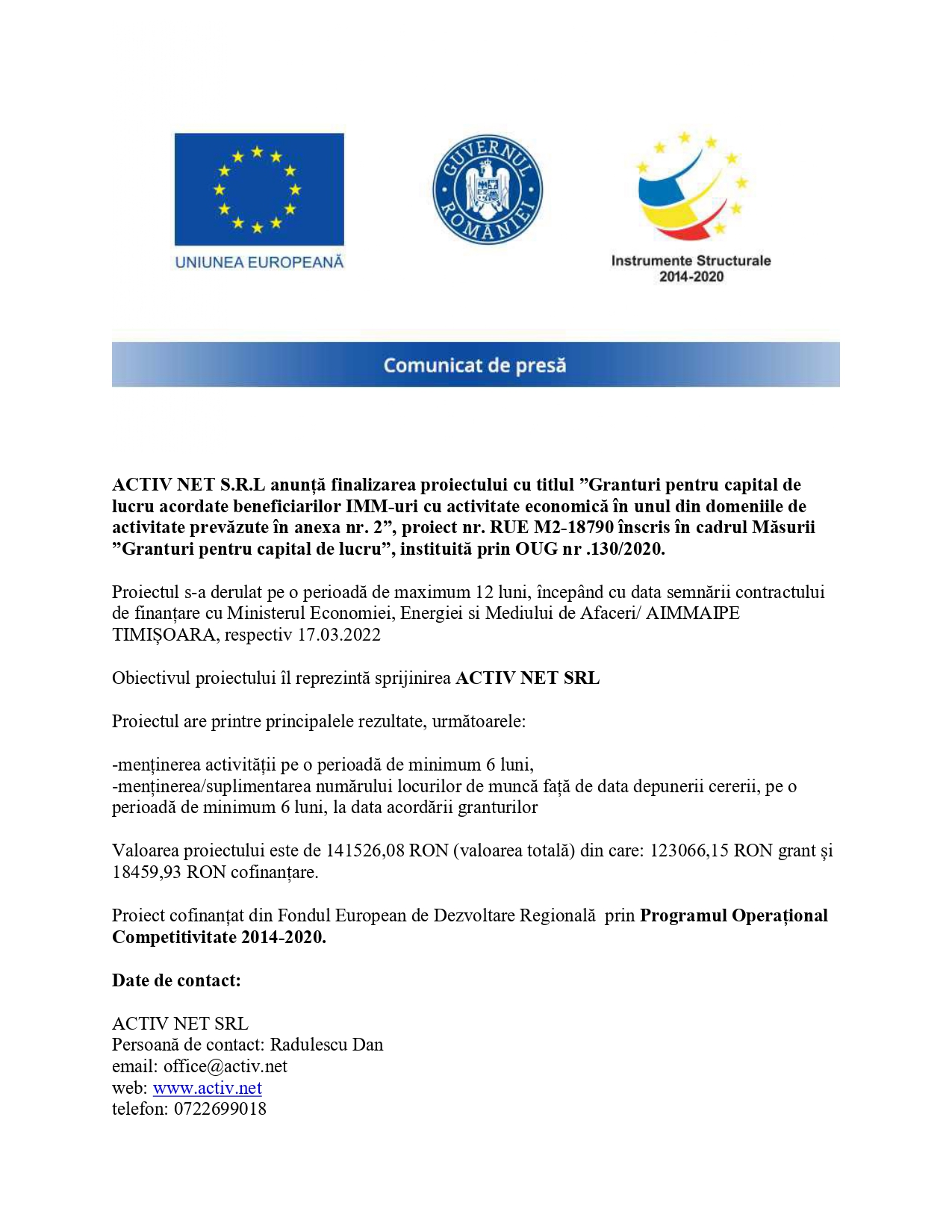 Obiectivul proiectului îl reprezintă sprijinirea ACTIV NET SRL