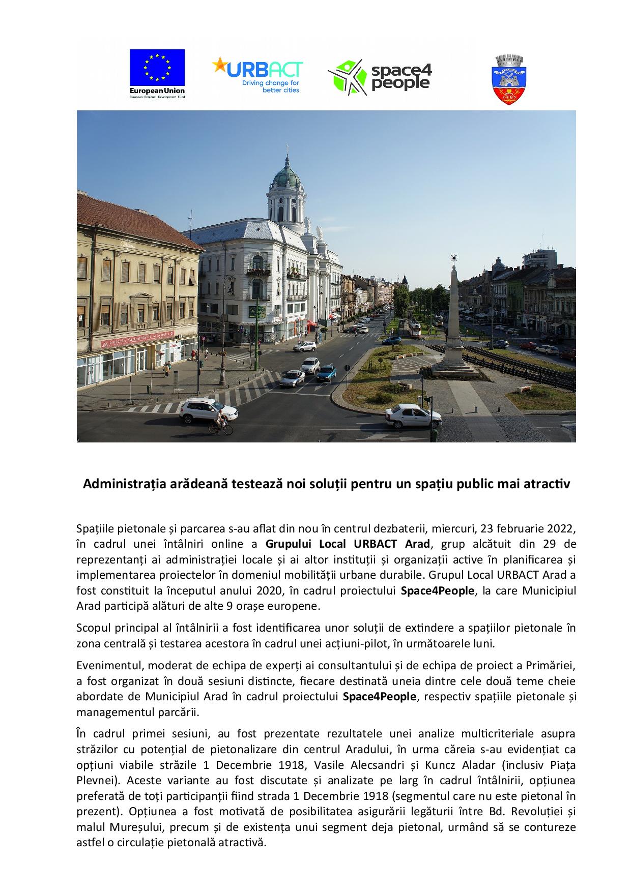 Spațiile pietonale și parcarea s-au aflat din nou în centrul dezbaterii, miercuri, 23 februarie 2022, în cadrul unei întâlniri online a Grupului Local URBACT Arad, grup alcătuit din 29 de reprezentanți ai administrației locale și ai altor instituții și organizații active în planificarea și implementarea proiectelor în domeniul mobilității urbane durabile. Grupul Local URBACT Arad a fost constituit la începutul anului 2020, în cadrul proiectului Space4People, la care Municipiul Arad participă alături de alte 9 orașe europene.