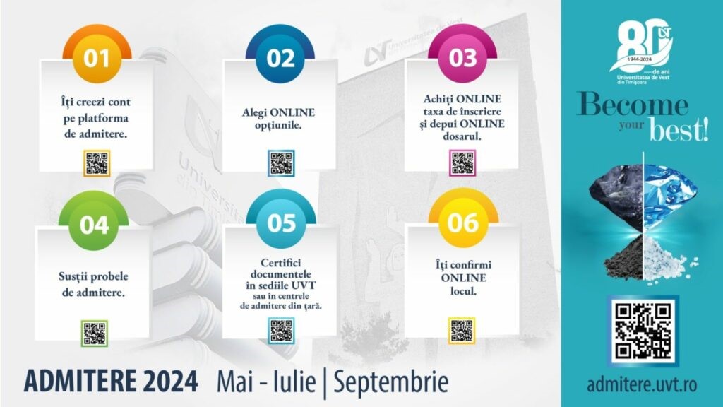 Toate informațiile despre procesul de admitere și oportunitățile pe care UVT le oferă sunt disponibile pe site-ul UVT dedicat procesului de admitere – admitere.uvt.ro.