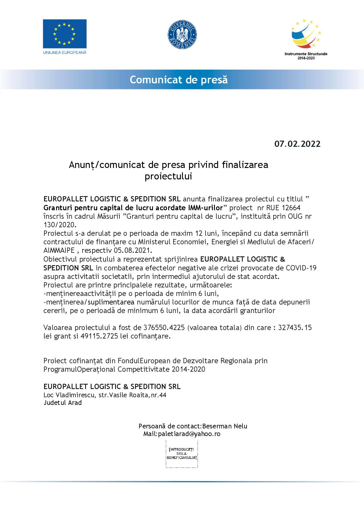 Obiectivul proiectului a reprezentat sprijinirea EUROPALLET LOGISTIC & SPEDITION SRL in combaterea efectelor negative ale crizei provocate de COVID-19 asupra activitatii societatii, prin intermediul ajutorului de stat acordat.