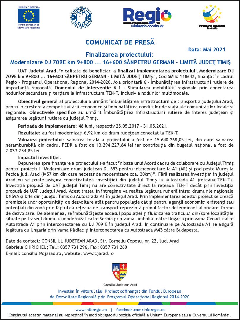 Depunerea spre finanțare a proiectului s-a făcut în baza unui Acord cadru de colaborare cu Judeţul Timiş pentru proiectul “Modernizare drum judeţean DJ 693 pentru interconectare la A1 (AR) şi pod peste Mureş la Pecica jud. Arad (l=57 km din care necesar de modernizare cca. 30km)”. Fără realizarea investiţiei în judeţul Arad nu se poate asigura conectivitatea investiţiei din judeţul Timiş la autostrada A1 (reţeaua TEN-T). Investiţia propusă de UAT judeţul Timiş nu are conectivitate direct la reţeaua TEN-T decât prin investiţia propusă de UAT Judeţul Arad. Acest traseu în întregime va realiza legătura rutieră între: drumurile naţionale DN59A şi DN6 din judeţul Timiş cu Autostrada A1 în judeţul Arad. Prin implementarea acestui proiect se creează premizele unor oportunităţi de dezvoltare atât pentru populaţie cât şi pentru agenţii economici existenţi sau potenţiali din zonă prin faptul că reţeaua de transport reprezintă primul factor determinant al oricărei forme de dezvoltare. De asemenea, se îmbunătăţeşte accesul populaţiei şi fluidizarea traficului din/spre localităţile situate pe traseul drumului modernizat către Serbia prin vama Jimbolia, către Ungaria prin vama Cenad, către Autostrada A1 prin interconectarea cu DJ 709 E în judeţul Arad. In continuare pe Autostrada A1 se asigură legătura cu Ungaria prin vama Nădlac şi interconectarea cu Autostrada M43 către Budapesta.