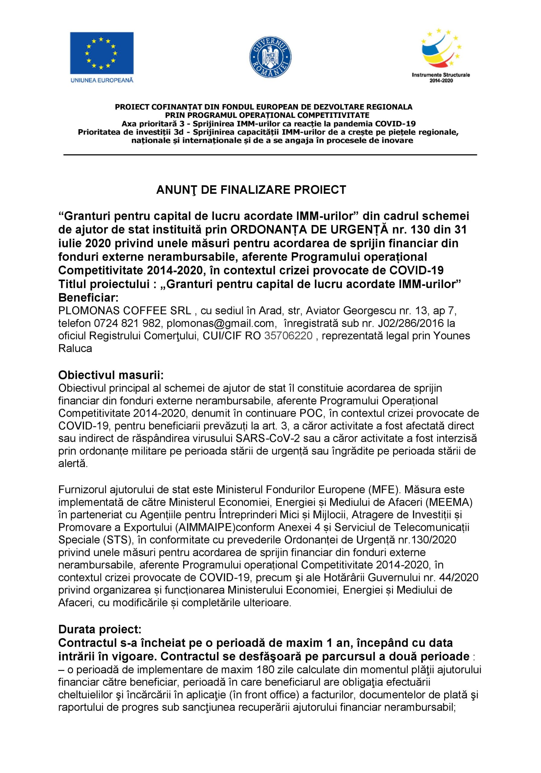 PLOMONAS COFFEE SRL , cu sediul în Arad, str, Aviator Georgescu nr. 13, ap 7, telefon 0724 821 982, plomonas@gmail.com, înregistrată sub nr. J02/286/2016 la oficiul Registrului Comerţului, CUI/CIF RO 35706220 , reprezentată legal prin Younes Raluca