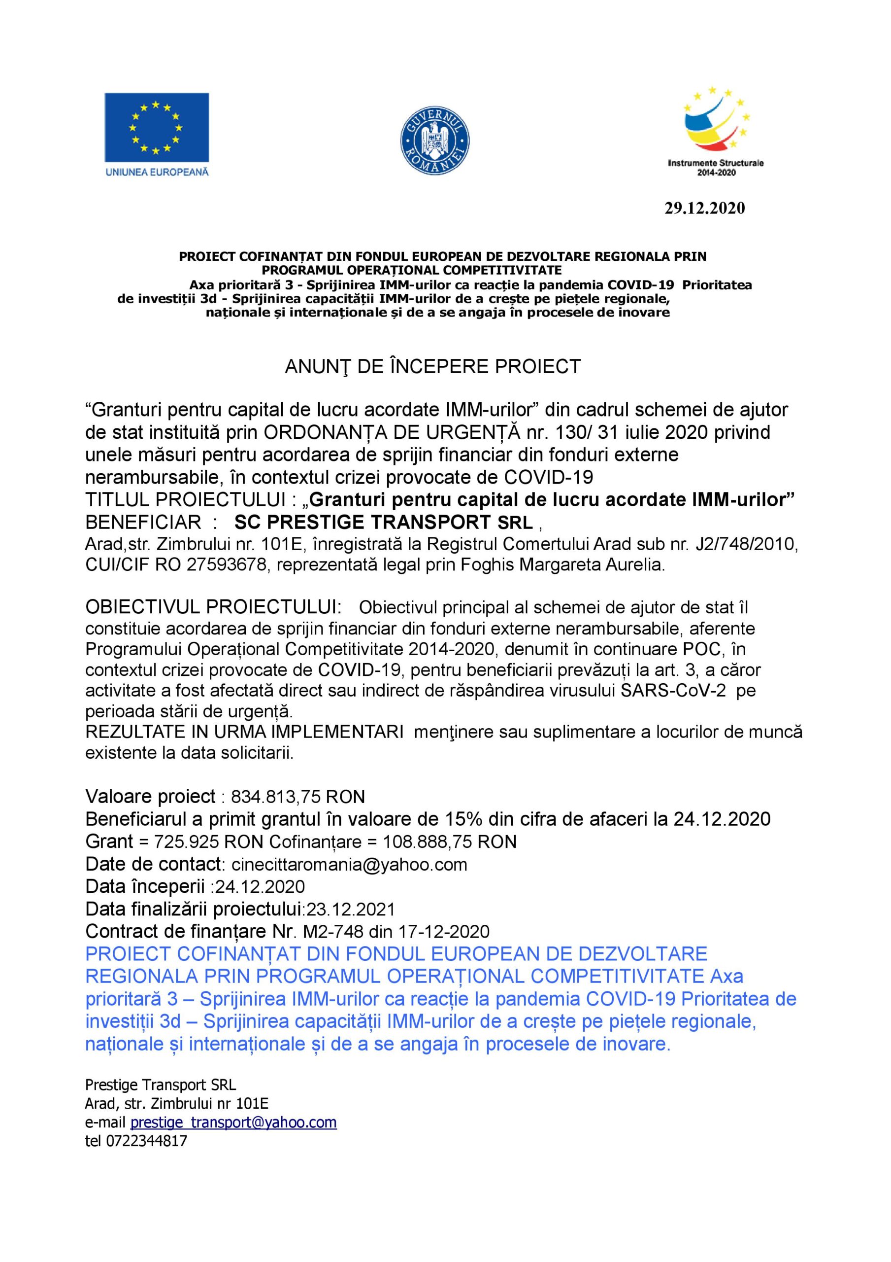 BENEFICIAR : SC PRESTIGE TRANSPORT SRL ,