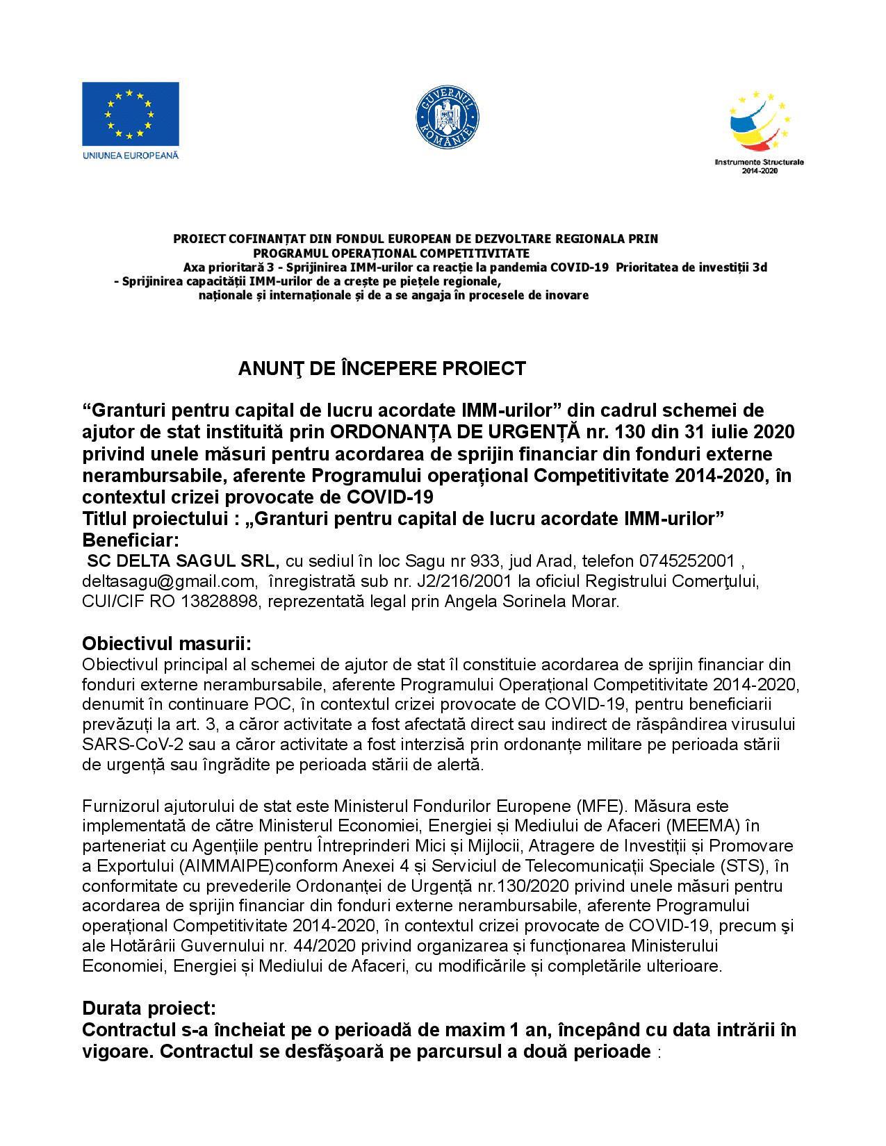 Titlul proiectului : „Granturi pentru capital de lucru acordate IMM-urilor”