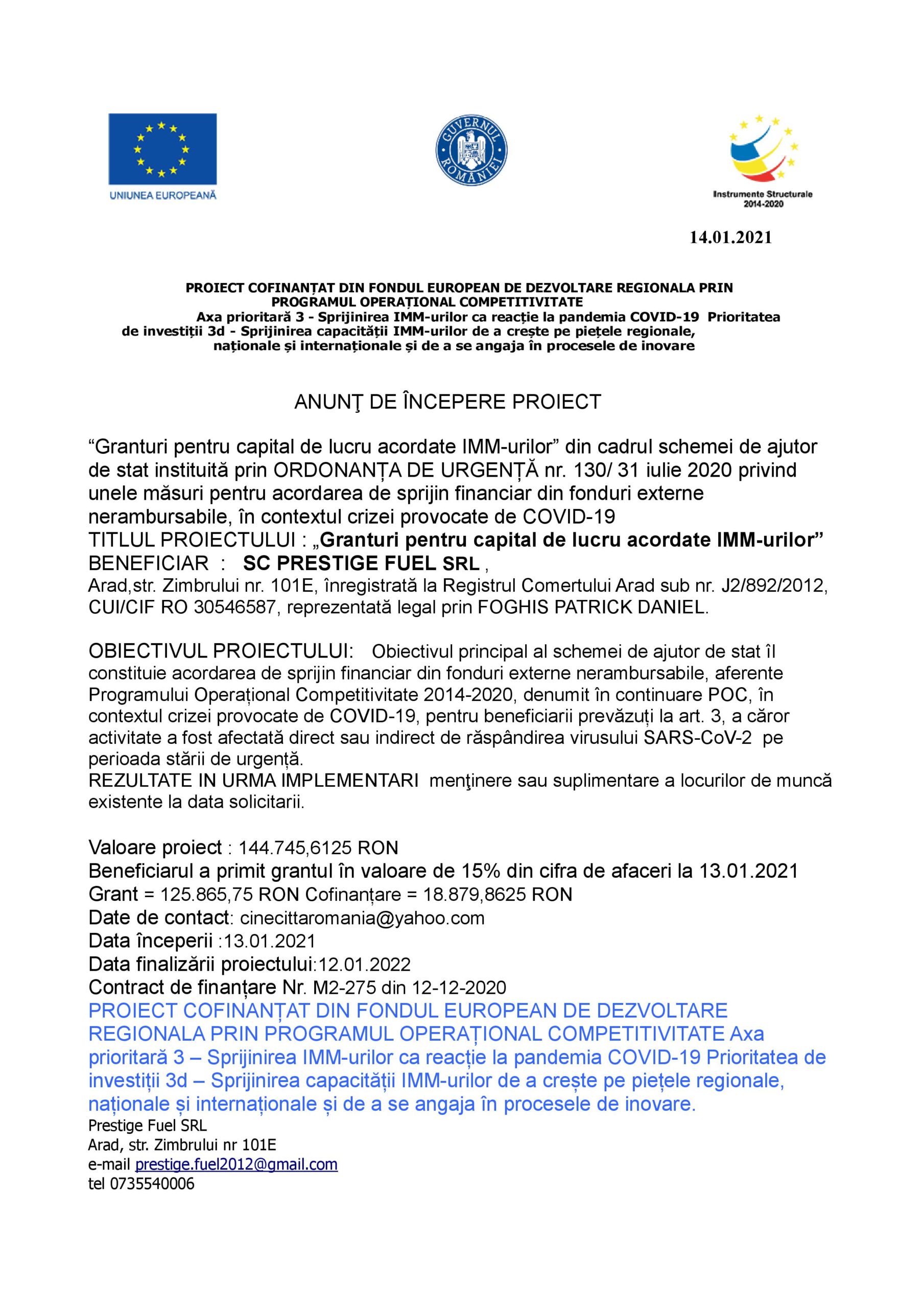 PROIECT COFINANȚAT DIN FONDUL EUROPEAN DE DEZVOLTARE REGIONALA PRIN PROGRAMUL OPERAȚIONAL COMPETITIVITATE Axa prioritară 3 – Sprijinirea IMM-urilor ca reacție la pandemia COVID-19 Prioritatea de investiții 3d – Sprijinirea capacității IMM-urilor de a crește pe piețele regionale, naționale și internaționale și de a se angaja în procesele de inovare.