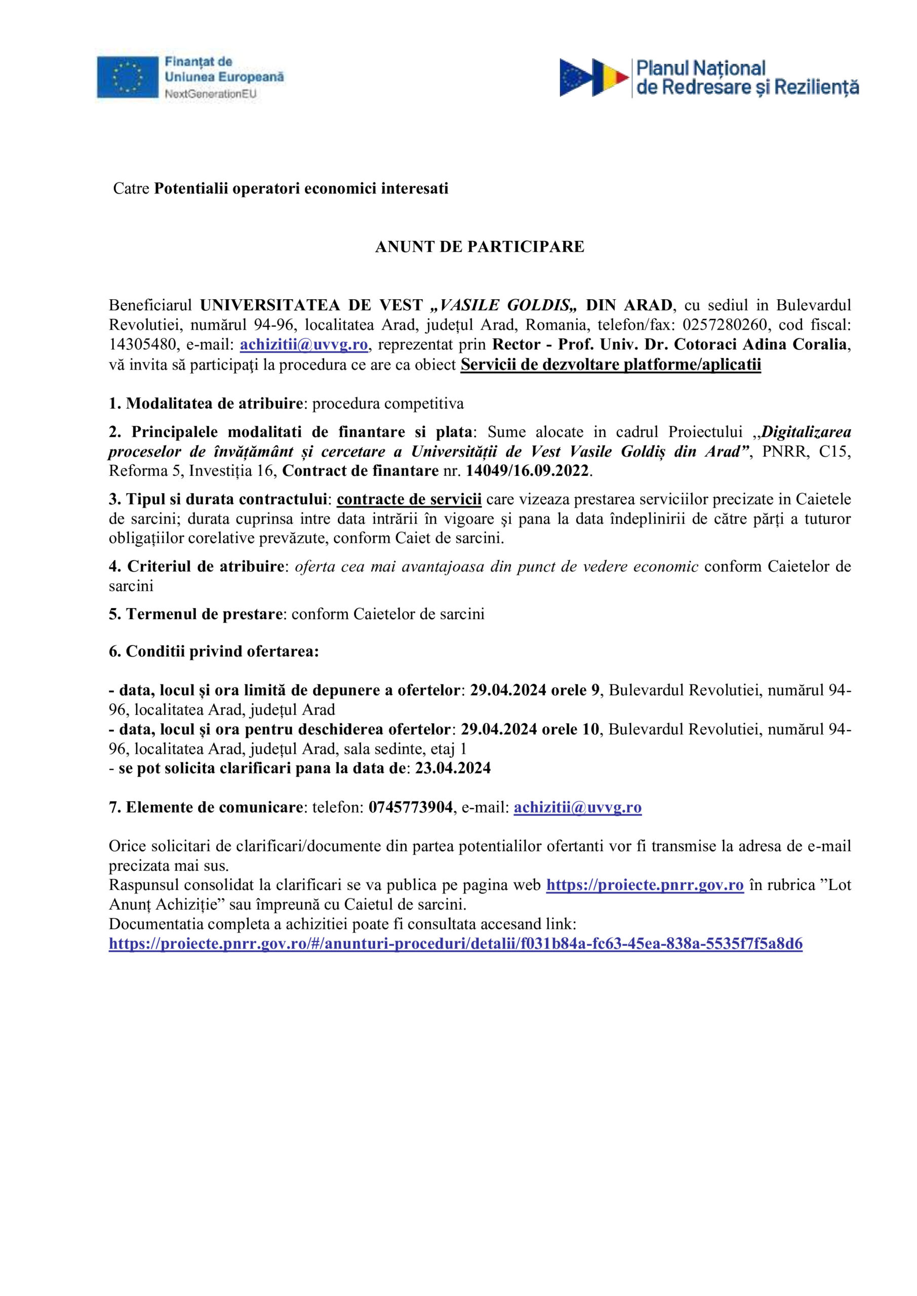 Raspunsul consolidat la clarificari se va publica pe pagina web https://proiecte.pnrr.gov.ro în rubrica ”Lot Anunț Achiziție” sau împreună cu Caietul de sarcini.