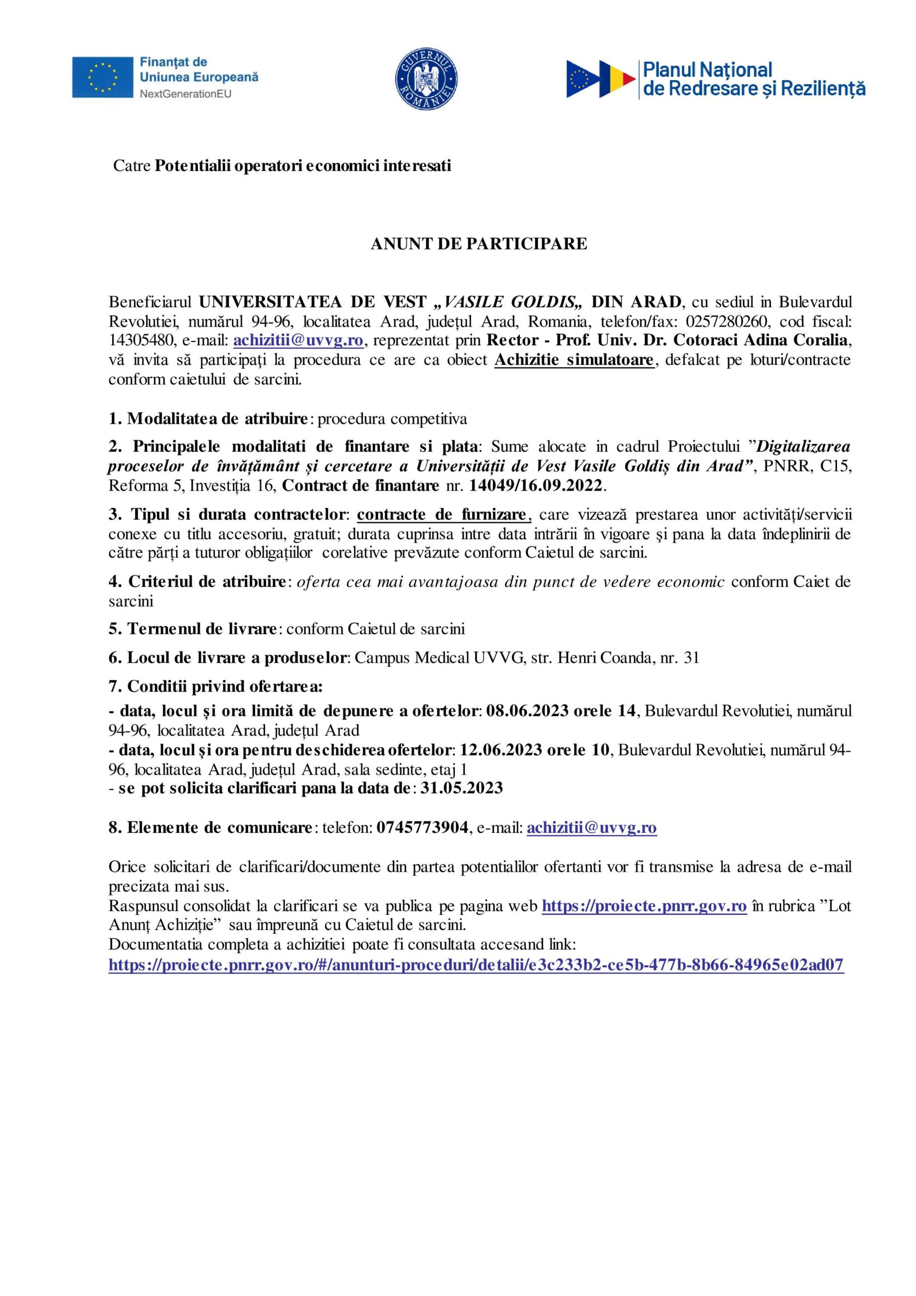 8. Elemente de comunicare: telefon: 0745773904, e-mail: achizitii@uvvg.ro
