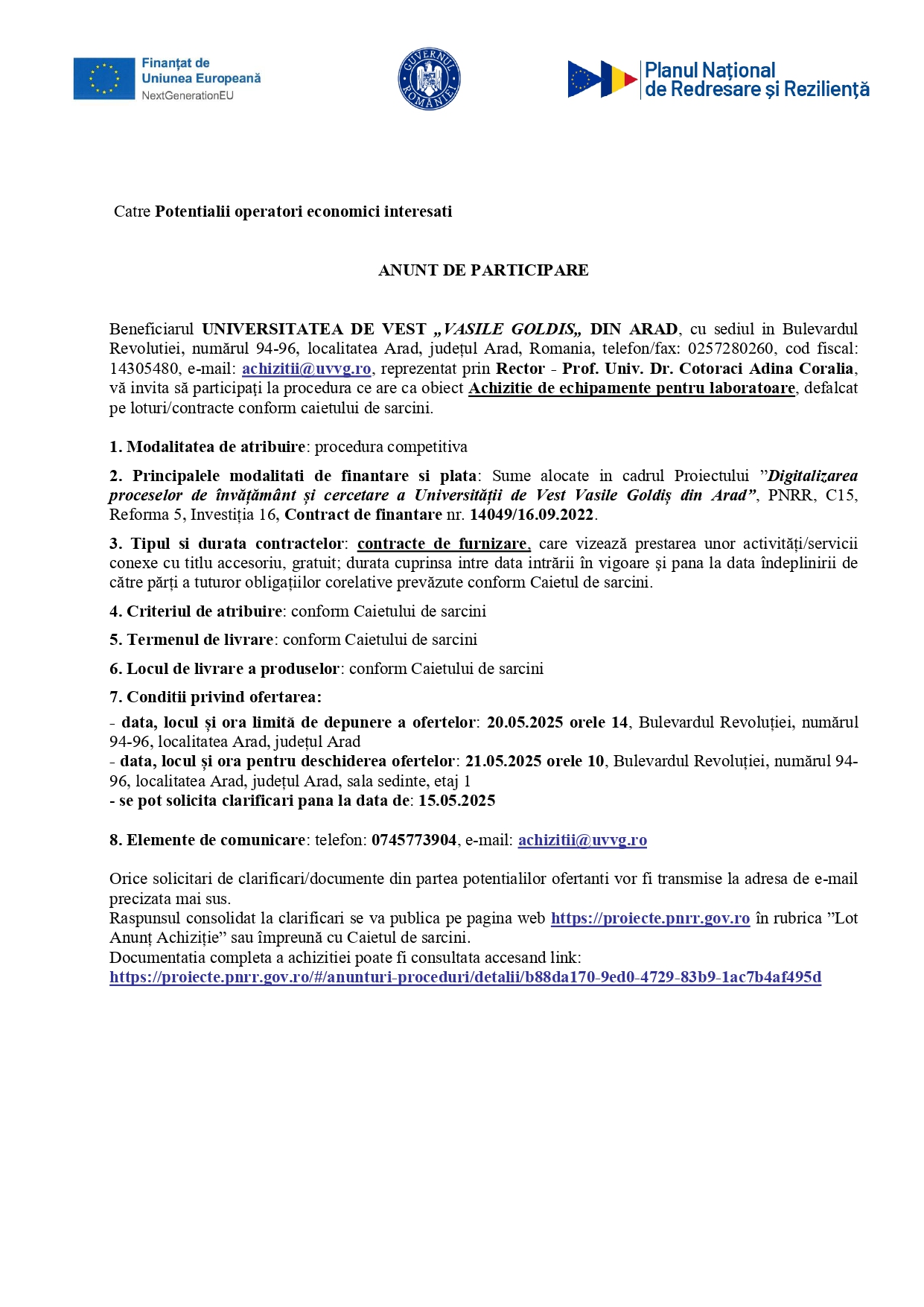 Beneficiarul UNIVERSITATEA DE VEST „VASILE GOLDIS”Achizitie de echipamente pentru laboratoare DIN ARAD, cu sediul in Bulevardul Revolutiei, numărul 94-96, localitatea Arad, județul Arad, Romania, telefon/fax: 0257280260, cod fiscal: 14305480, e-mail: achizitii@uvvg.ro, reprezentat prin Rector – Prof. Univ. Dr. Cotoraci Adina Coralia, vă invita să participaţi la procedura ce are ca obiect Achizitie de echipamente pentru laboratoare, defalcat pe loturi/contracte conform caietului de sarcini.