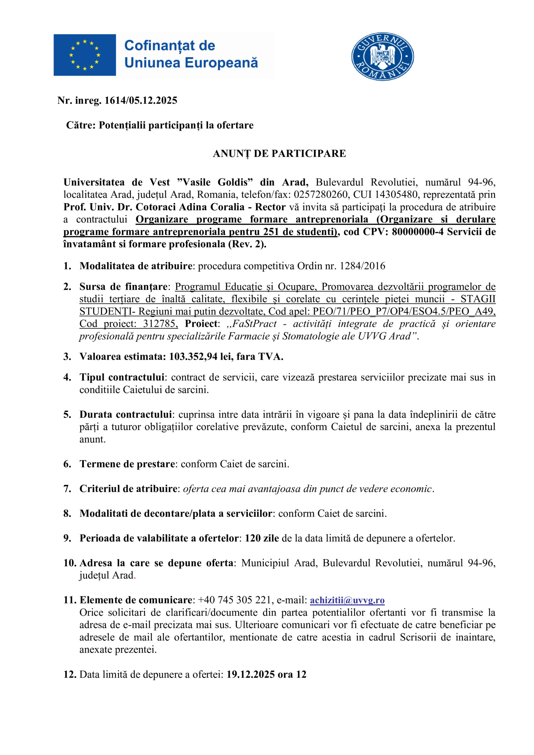 Data limită de depunere a ofertei: 19.12.2025 ora 12