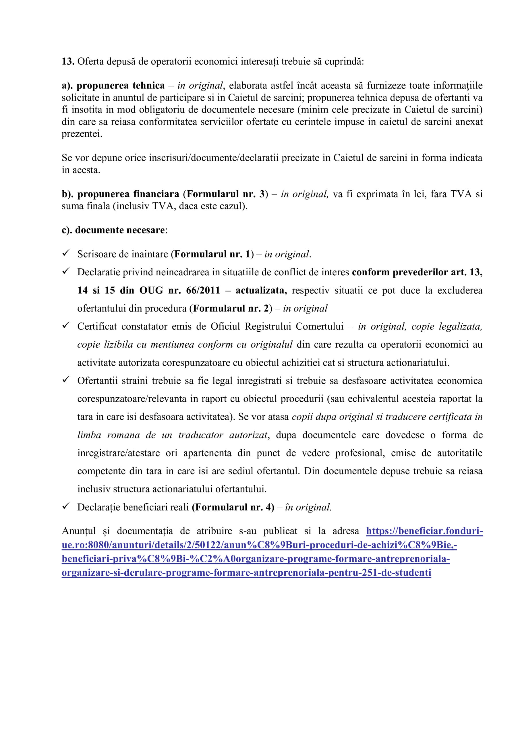 Anunțul și documentația de atribuire s-au publicat si la adresa https://beneficiar.fonduri-ue.ro:8080/anunturi/details/2/50122/anun%C8%9Buri-proceduri-de-achizi%C8%9Bie,-beneficiari-priva%C8%9Bi-%C2%A0organizare-programe-formare-antreprenoriala-organizare-si-derulare-programe-formare-antreprenoriala-pentru-251-de-studenti