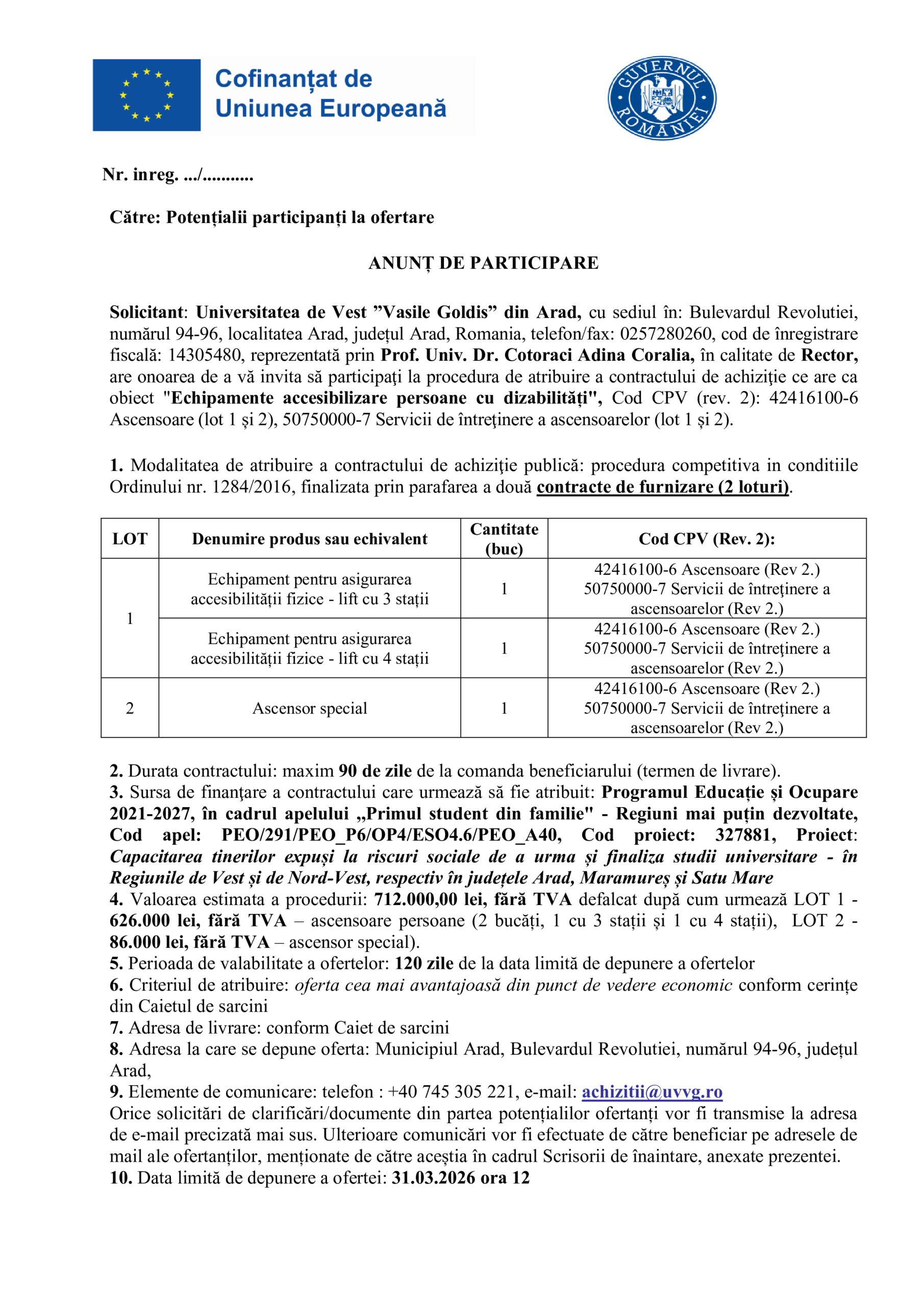 Solicitant: Universitatea de Vest ”Vasile Goldis” din Arad, cu sediul în: Bulevardul Revolutiei, numărul 94-96, localitatea Arad, județul Arad, Romania, telefon/fax: 0257280260, cod de înregistrare fiscală: 14305480, reprezentată prin Prof. Univ. Dr. Cotoraci Adina Coralia, în calitate de Rector, are onoarea de a vă invita să participaţi la procedura de atribuire a contractului de achiziţie ce are ca obiect “Echipamente accesibilizare persoane cu dizabilități”, Cod CPV (rev. 2): 42416100-6 Ascensoare (lot 1 și 2), 50750000-7 Servicii de întreţinere a ascensoarelor (lot 1 și 2).