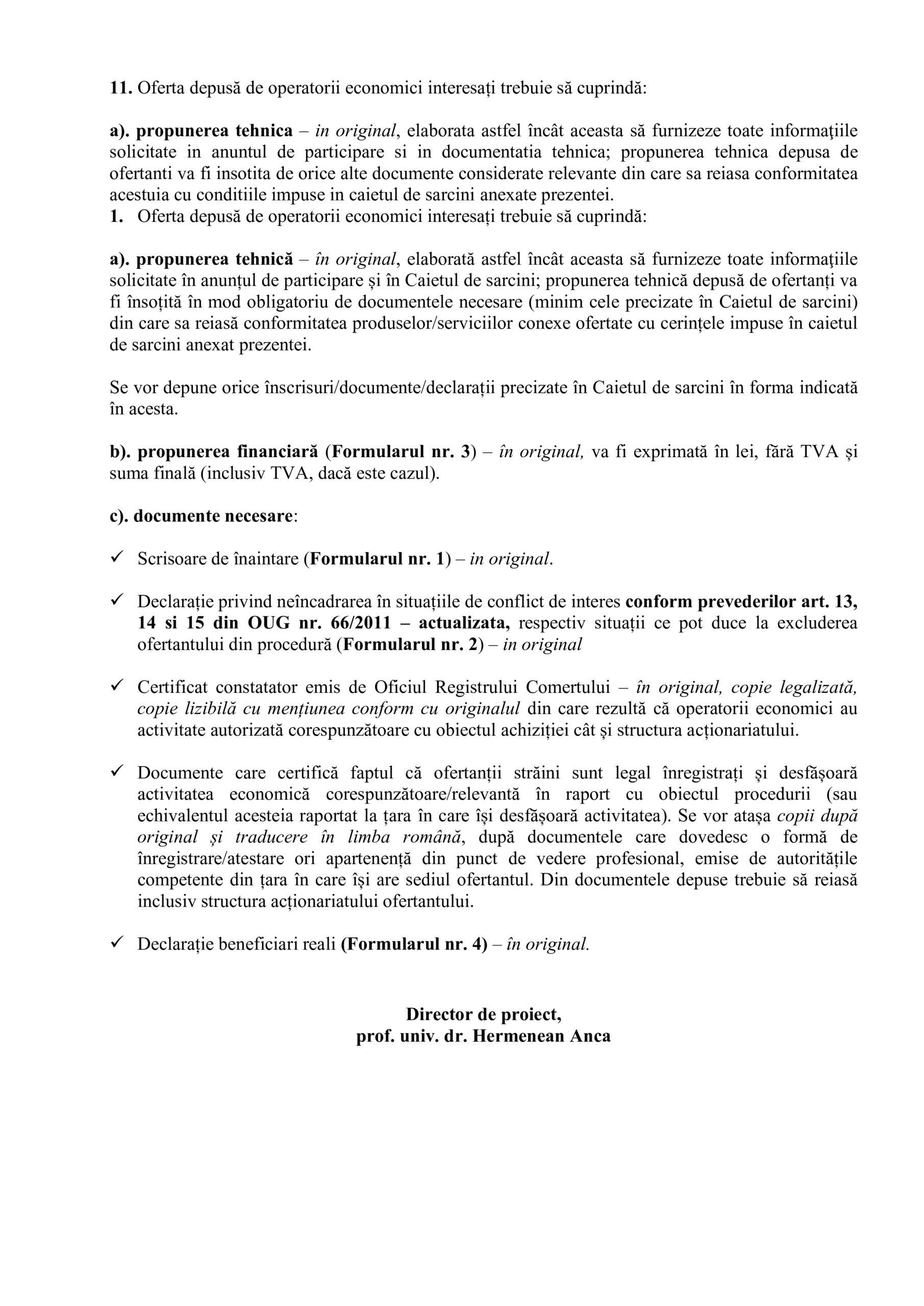 11. Oferta depusă de operatorii economici interesați trebuie să cuprindă:
