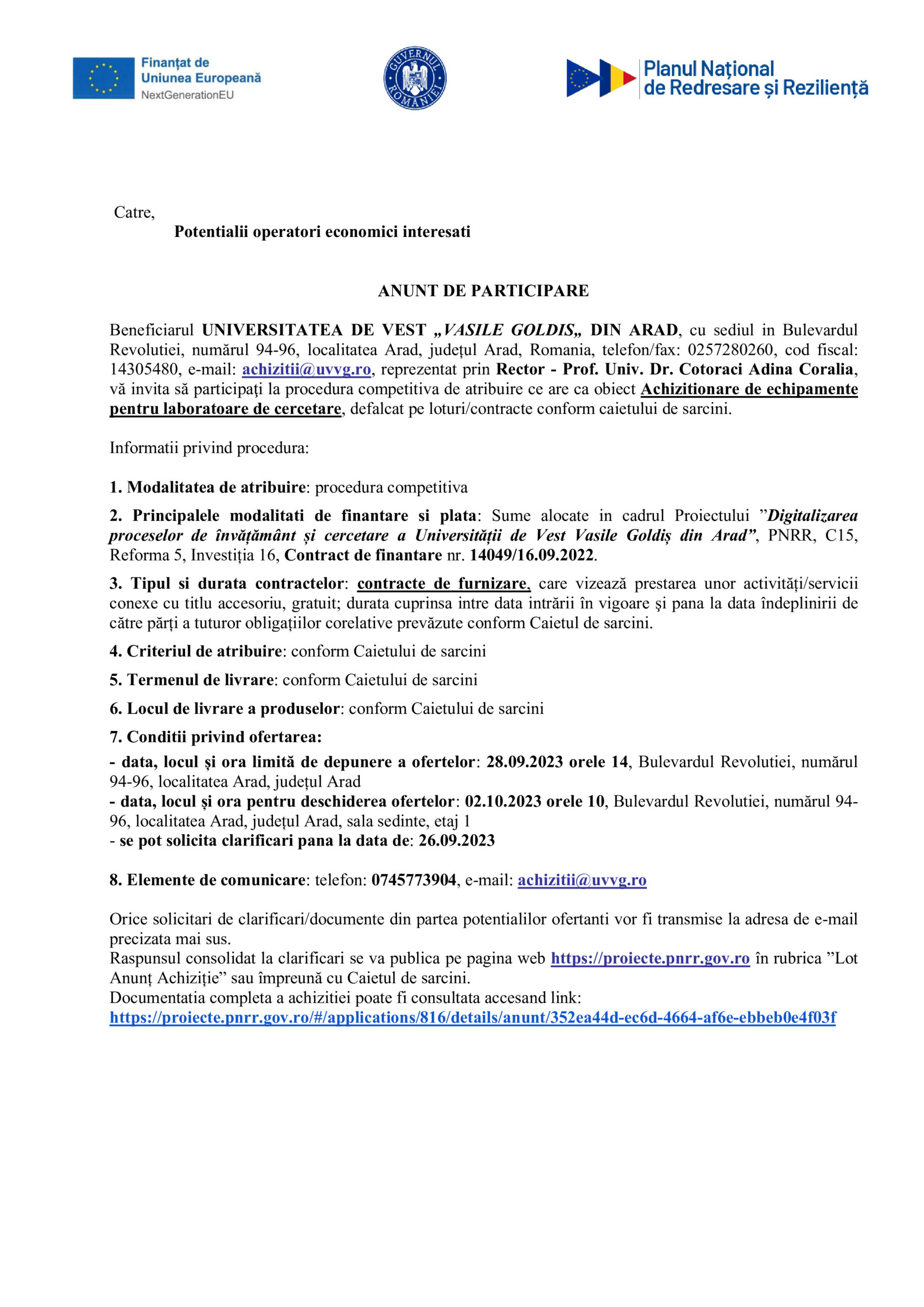 – data, locul și ora limită de depunere a ofertelor: 28.09.2023 orele 14, Bulevardul Revolutiei, numărul 94-96, localitatea Arad, județul Arad