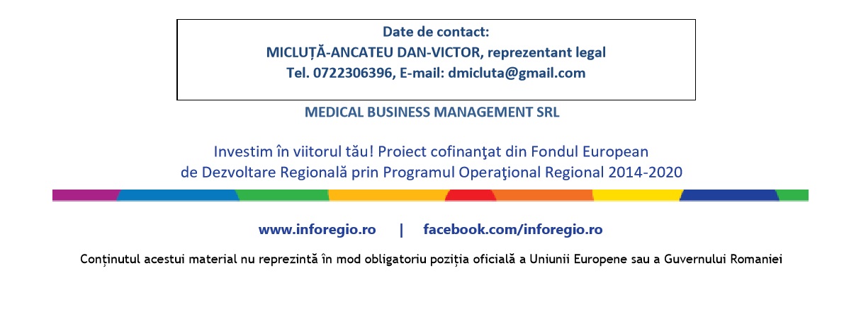 Societatea MEDICAL BUSINESS MANAGEMENT SRL, derulează începând cu data de 12.02.2021, proiectul “Construire clinică medicală și amenajări aferente, mijloace de publicitate și împrejmuire teren”, cod SMIS 135671 în cadrul Regio-Program Operaţional Regional (POR 2014-2020), Axa prioritară 2 Îmbunătățirea competitivității întreprinderilor mici și mijlocii, Prioritatea de investiții 2.2 – Sprijinirea creării și extinderea capacităților avansate de producție și dezvoltarea serviciilor.