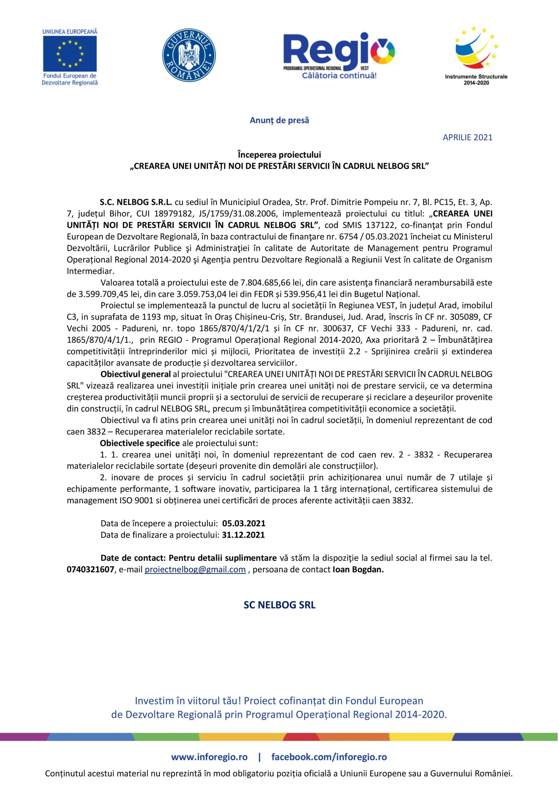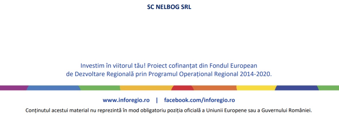 S.C. NELBOG S.R.L. cu sediul în Municipiul Oradea, Str. Prof. Dimitrie Pompeiu nr. 7, Bl. PC15, Et. 3, Ap. 7, județul Bihor, CUI 18979182, J5/1759/31.08.2006, implementează proiectului cu titlul: „CREAREA UNEI UNITĂȚI NOI DE PRESTĂRI SERVICII ÎN CADRUL NELBOG SRL”, cod SMIS 137122, co-finanţat prin Fondul European de Dezvoltare Regională, în baza contractului de finanţare nr. 6754 / 05.03.2021 încheiat cu Ministerul Dezvoltării, Lucrărilor Publice şi Administraţiei în calitate de Autoritate de Management pentru Programul Operațional Regional 2014-2020 şi Agenţia pentru Dezvoltare Regională a Regiunii Vest în calitate de Organism Intermediar.