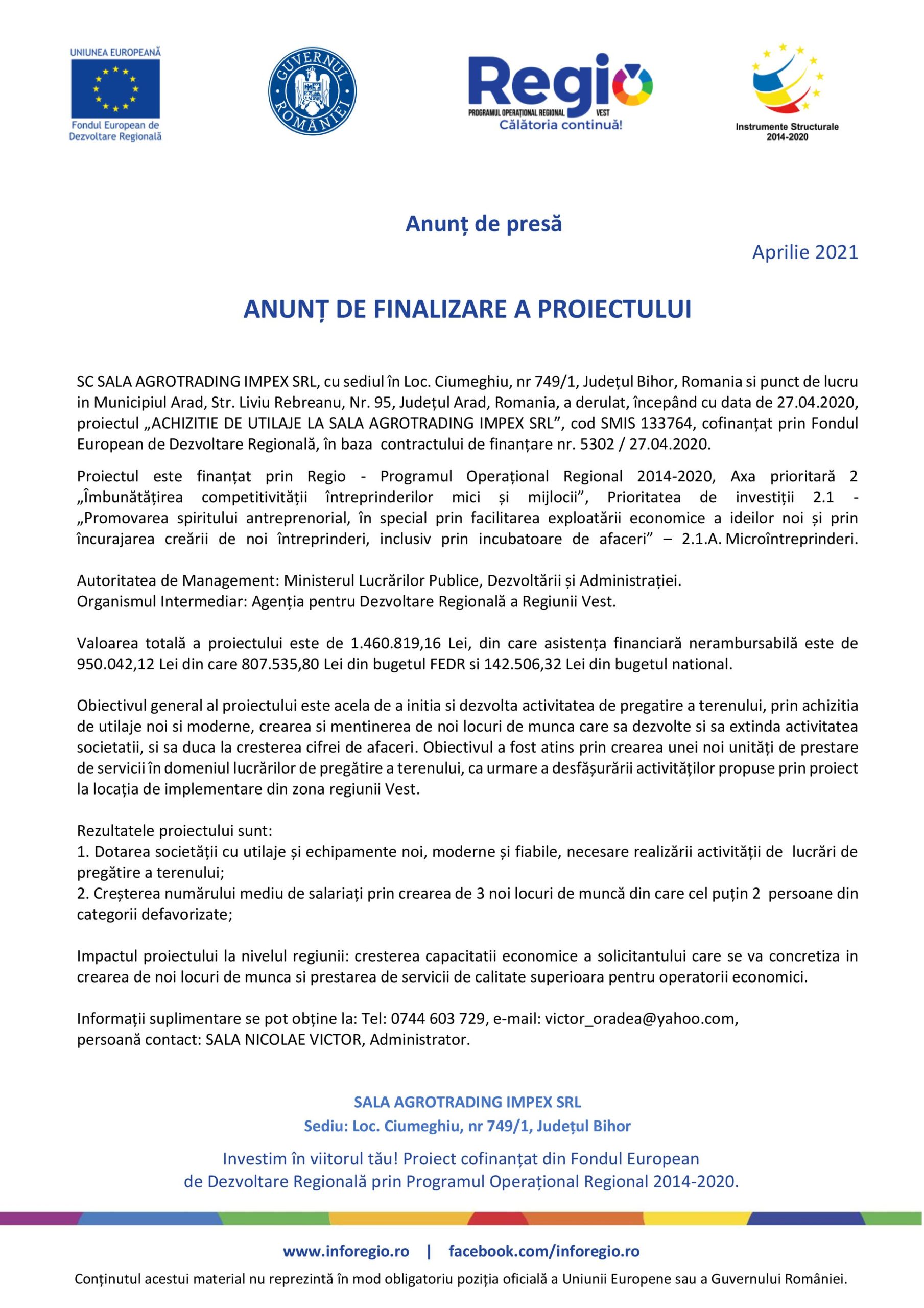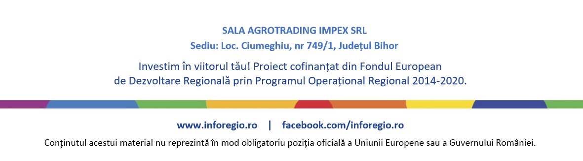 SC SALA AGROTRADING IMPEX SRL, cu sediul în Loc. Ciumeghiu, nr 749/1, Județul Bihor, Romania si punct de lucru in Municipiul Arad, Str. Liviu Rebreanu, Nr. 95, Județul Arad, Romania, a derulat, începând cu data de 27.04.2020, proiectul „ACHIZITIE DE UTILAJE LA SALA AGROTRADING IMPEX SRL”, cod SMIS 133764, cofinanțat prin Fondul European de Dezvoltare Regională, în baza contractului de finanțare nr. 5302 / 27.04.2020.