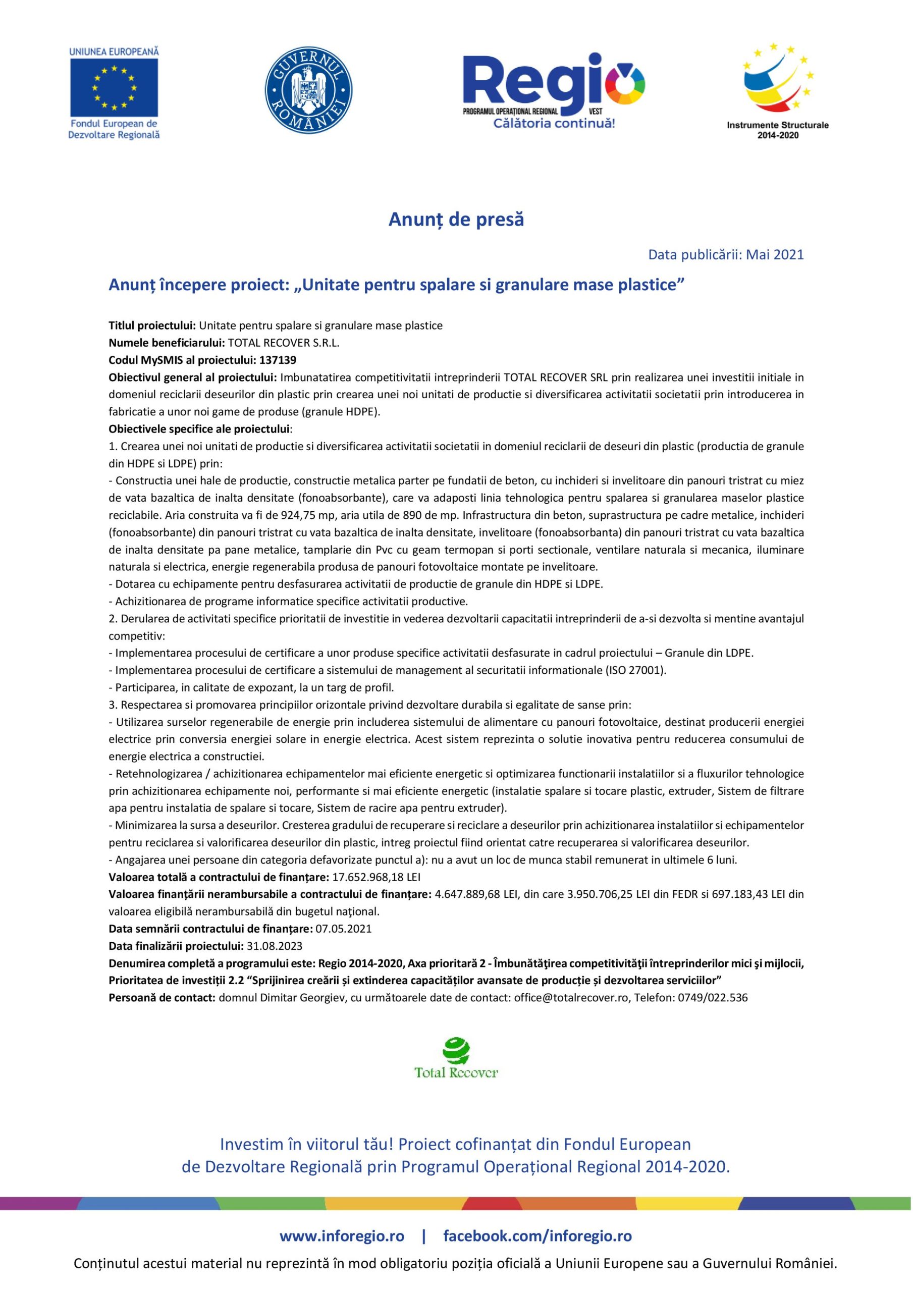 Obiectivul general al proiectului: Imbunatatirea competitivitatii intreprinderii TOTAL RECOVER SRL prin realizarea unei investitii initiale in domeniul reciclarii deseurilor din plastic prin crearea unei noi unitati de productie si diversificarea activitatii societatii prin introducerea in fabricatie a unor noi game de produse (granule HDPE).