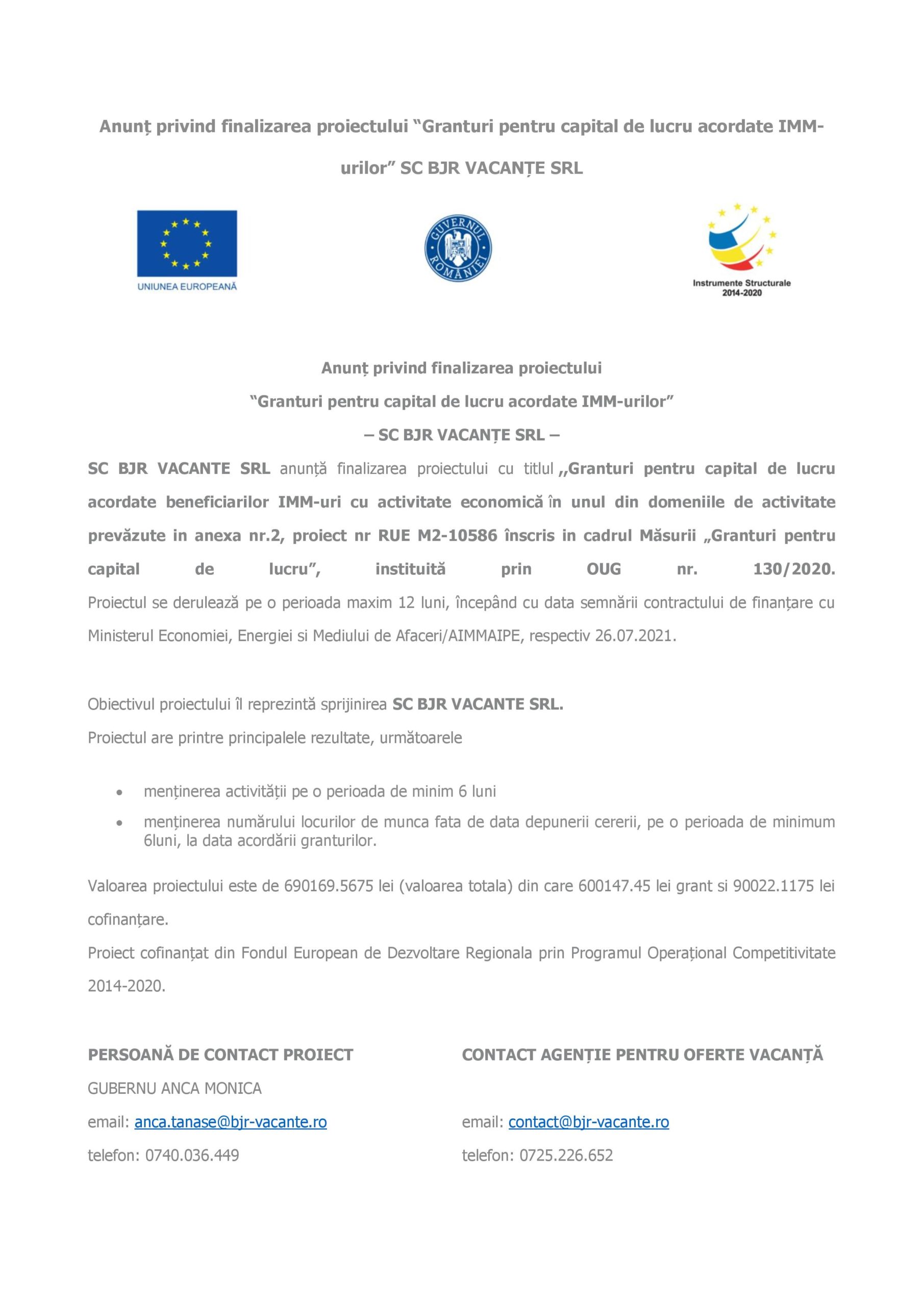 SC BJR VACANTE SRL anunță finalizarea proiectului cu titlul ,,Granturi pentru capital de lucru acordate beneficiarilor IMM-uri cu activitate economică în unul din domeniile de activitate prevăzute in anexa nr.2, proiect nr RUE M2-10586 înscris in cadrul Măsurii „Granturi pentru capital de lucru”, instituită prin OUG nr. 130/2020.