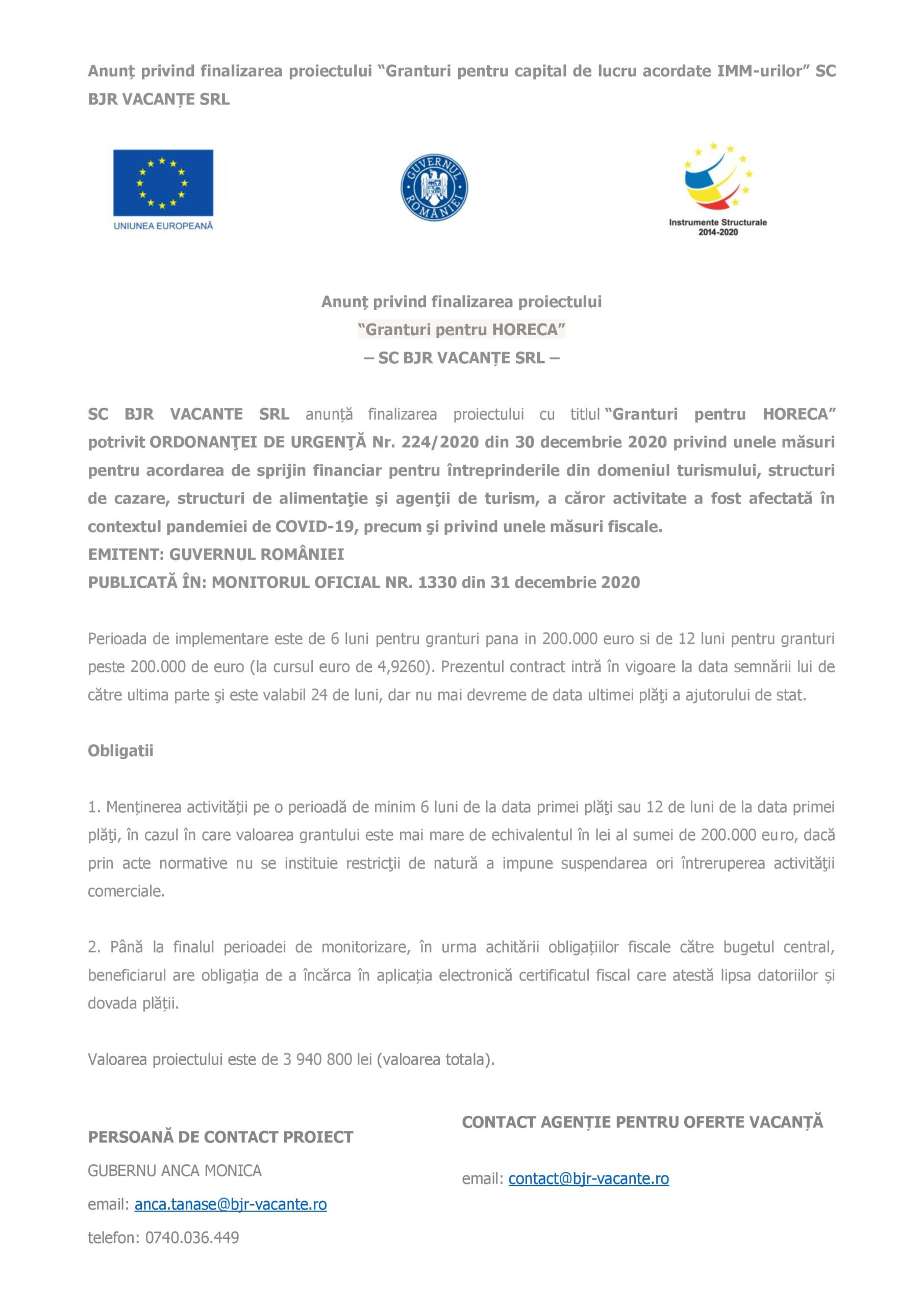 SC BJR VACANTE SRL anunță finalizarea proiectului cu titlul “Granturi pentru HORECA” potrivit ORDONANŢEI DE URGENŢĂ Nr. 224/2020 din 30 decembrie 2020 privind unele măsuri pentru acordarea de sprijin financiar pentru întreprinderile din domeniul turismului, structuri de cazare, structuri de alimentaţie şi agenţii de turism, a căror activitate a fost afectată în contextul pandemiei de COVID-19, precum şi privind unele măsuri fiscale.