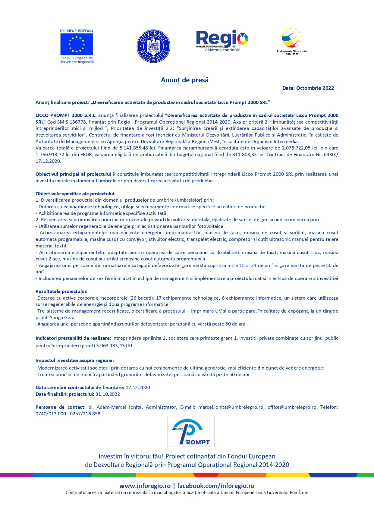LICCO PROMPT 2000 S.R.L. anunţă finalizarea proiectului “Diversificarea activitatii de productie in cadrul societatii Licco Prompt 2000 SRL“ Cod SMIS 136778, finanțat prin Regio – Programul Operaţional Regional 2014-2020, Axa prioritară 2: ”Îmbunătăţirea competitivităţii întreprinderilor mici și mijlocii”, Prioritatea de investiţii 2.2: “Sprijinirea creării și extinderea capacităților avansate de producție și dezvoltarea serviciilor”. Contractul de finanțare a fost încheiat cu Ministerul Dezvoltării, Lucrărilor Publice și Administrației în calitate de Autoritate de Management și cu Agenţia pentru Dezvoltare Regională a Regiunii Vest, în calitate de Organism Intermediar.