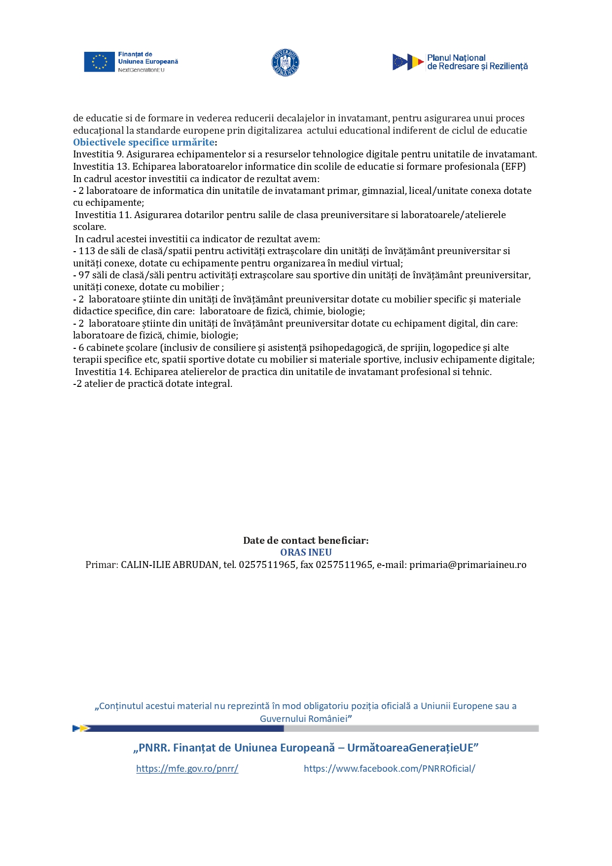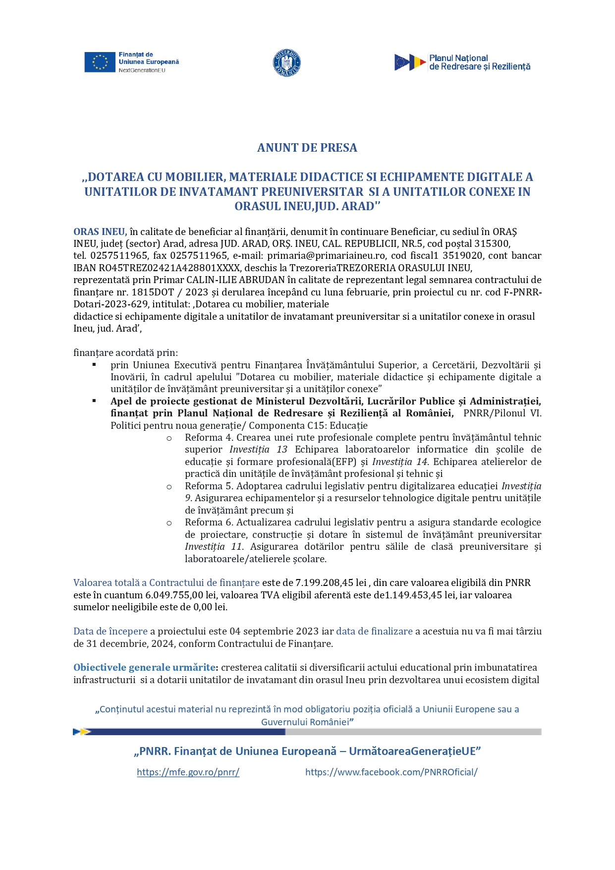 ORAS INEU, în calitate de beneficiar al finanțării, denumit în continuare Beneficiar, cu sediul în ORAŞ INEU, județ (sector) Arad, adresa JUD. ARAD, ORŞ. INEU, CAL. REPUBLICII, NR.5, cod poștal 315300, tel. 0257511965, fax 0257511965, e-mail: primaria@primariaineu.ro, cod fiscal1 3519020, cont bancar IBAN RO45TREZ02421A428801XXXX, deschis la TrezoreriaTREZORERIA ORASULUI INEU, reprezentată prin Primar CALIN-ILIE ABRUDAN în calitate de reprezentant legal semnarea contractului de finanțare nr. 1815DOT ⁄ 2023 și derularea începând cu luna februarie, prin proiectul cu nr. cod F-PNRR-Dotari-2023-629, intitulat: ‚Dotarea cu mobilier, materiale didactice si echipamente digitale a unitatilor de invatamant preuniversitar si a unitatilor conexe in orasul Ineu, jud. Arad’, finanțare acordată prin: