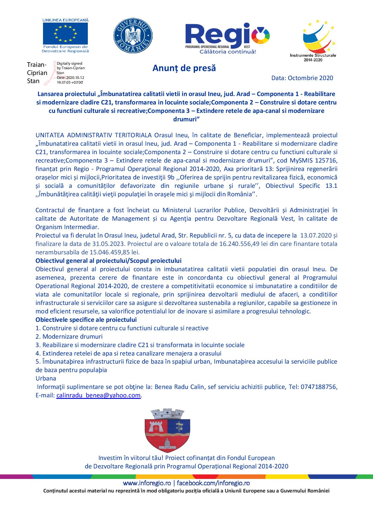 UNITATEA ADMINISTRATIV TERITORIALA Orasul Ineu, în calitate de Beneficiar, implementează proiectul „Îmbunatatirea calitatii vietii in orasul Ineu, jud. Arad – Componenta 1 – Reabilitare si modernizare cladire C21, transformarea in locuinte sociale;Componenta 2 – Construire si dotare centru cu functiuni culturale si recreative;Componenta 3 – Extindere retele de apa-canal si modernizare drumuri”, cod MySMIS 125716, finanțat prin Regio – Programul Operaţional Regional 2014-2020, Axa prioritară 13: Sprijinirea regenerării orașelor mici și mijlocii,Prioritatea de investiţii 9b ,,Oferirea de sprijin pentru revitalizarea fizică, economică și socială a comunităților defavorizate din regiunile urbane și rurale’’, Obiectivul Specific 13.1 ,,Îmbunătăţirea calităţii vieţii populaţiei în oraşele mici şi mijlocii din România’’.