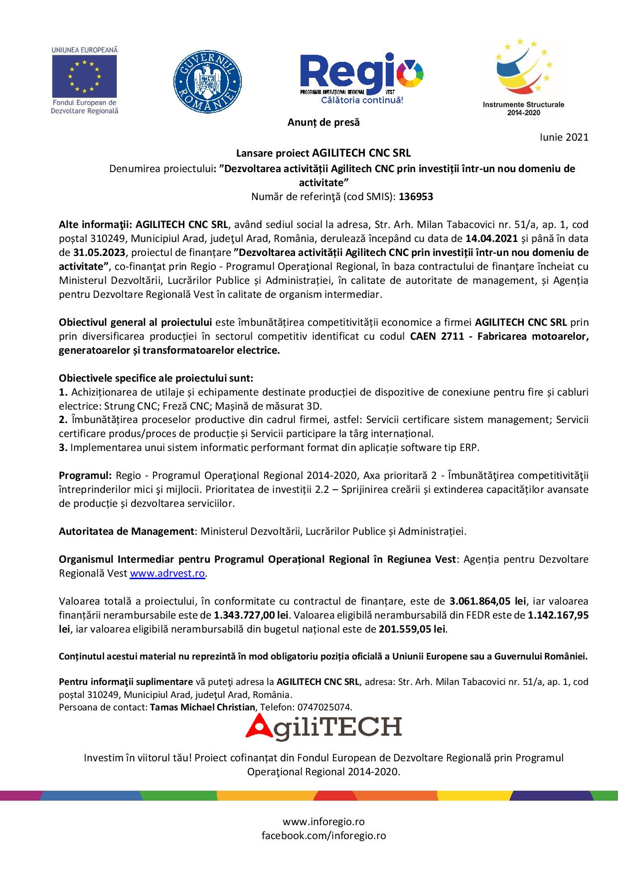 Alte informaţii: AGILITECH CNC SRL, având sediul social la adresa, Str. Arh. Milan Tabacovici nr. 51/a, ap. 1, cod poștal 310249, Municipiul Arad, judeţul Arad, România, derulează începând cu data de 14.04.2021 și până în data de 31.05.2023, proiectul de finanțare ”Dezvoltarea activității Agilitech CNC prin investiții într-un nou domeniu de activitate”, co-finanţat prin Regio – Programul Operaţional Regional, în baza contractului de finanţare încheiat cu Ministerul Dezvoltării, Lucrărilor Publice și Administrației, în calitate de autoritate de management, și Agenția pentru Dezvoltare Regională Vest în calitate de organism intermediar.