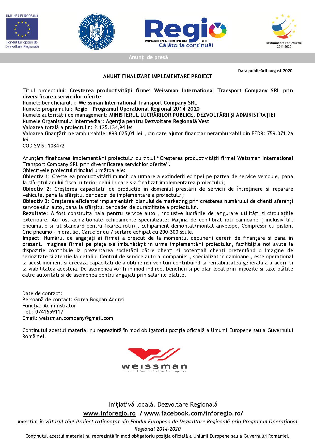 Numele beneficiarului: Weissman International Transport Company SRL