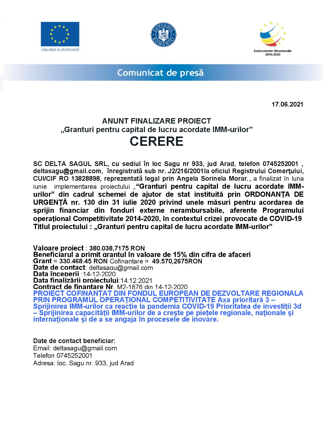 SC DELTA SAGUL SRL, cu sediul în loc Sagu nr 933, jud Arad, telefon 0745252001 , deltasagu@gmail.com, înregistrată sub nr. J2/216/2001la oficiul Registrului Comerţului, CUI/CIF RO 13828898, reprezentată legal prin Angela Sorinela Morar., a finalizat în luna iunie implementarea proiectului „“Granturi pentru capital de lucru acordate IMM-urilor” din cadrul schemei de ajutor de stat instituită prin ORDONANȚA DE URGENȚĂ nr. 130 din 31 iulie 2020 privind unele măsuri pentru acordarea de sprijin financiar din fonduri externe nerambursabile, aferente Programului operațional Competitivitate 2014-2020, în contextul crizei provocate de COVID-19
