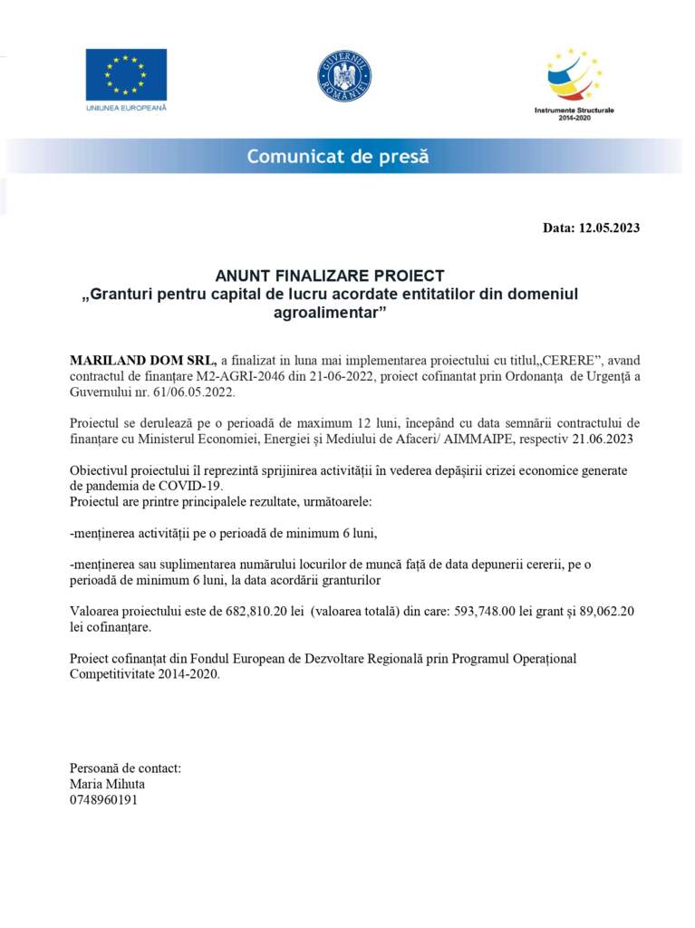 Proiectul se derulează pe o perioadă de maximum 12 luni, începând cu data semnării contractului de finanțare cu Ministerul Economiei, Energiei și Mediului de Afaceri/ AIMMAIPE, respectiv 21.06.2023