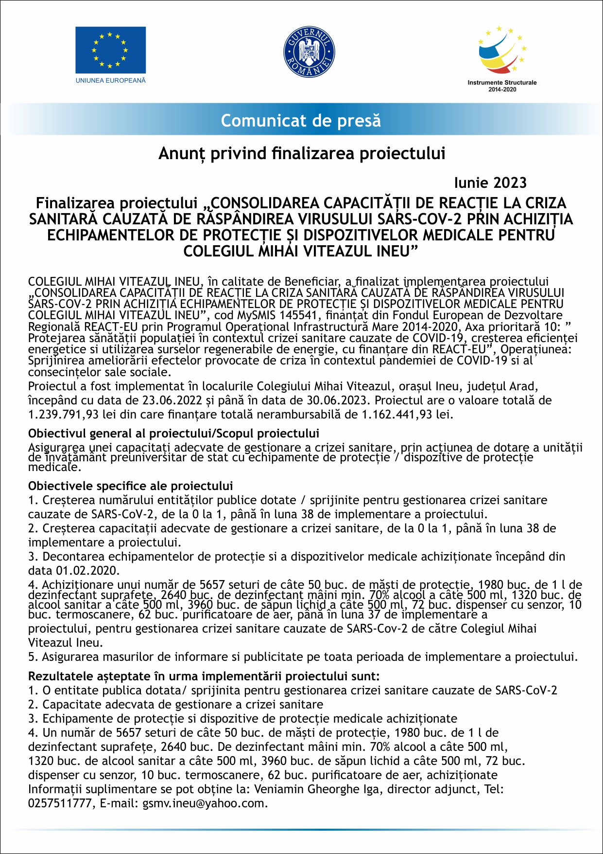 COLEGIUL MIHAI VITEAZUL INEU, în calitate de Beneficiar, a finalizat implementarea proiectului „CONSOLIDAREA CAPACITĂȚII DE REACȚIE LA CRIZA SANITARĂ CAUZATĂ DE RĂSPÂNDIREA VIRUSULUI SARS-COV-2 PRIN ACHIZIȚIA ECHIPAMENTELOR DE PROTECȚIE ȘI DISPOZITIVELOR MEDICALE PENTRU COLEGIUL MIHAI VITEAZUL INEU”, cod MySMIS 145541, finanțat din Fondul European de Dezvoltare Regională REACT-EU prin Programul Operațional Infrastructură Mare 2014-2020, Axa prioritară 10: ” Protejarea sănătății populației în contextul crizei sanitare cauzate de COVID-19, creșterea eficienței energetice si utilizarea surselor regenerabile de energie, cu finanțare din REACT-EU”, Operațiunea: Sprijinirea ameliorării efectelor provocate de criza în contextul pandemiei de COVID-19 si al consecințelor sale sociale.