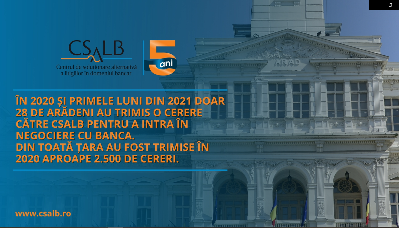 Anul trecut aproape 2.500 de români s-au adresat Centrului de Soluționare Alternativă a Litigiilor în domeniul Bancar (CSALB). Numărul arădenilor care au trimis cereri către CSALB este printre cele mai mici din țară. Doar 28 de consumatori din Arad au solicitat în 2020 și primele luni din 2021 o negociere cu banca sau IFN-ul pentru contractele aflate în derulare.