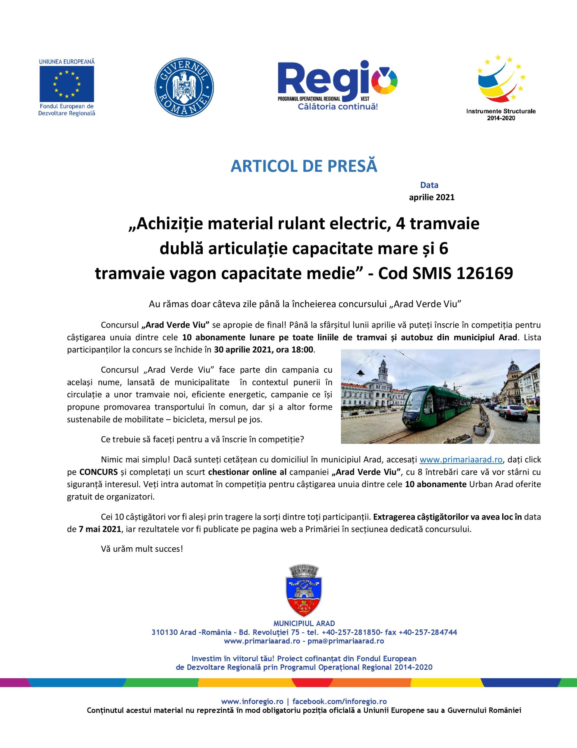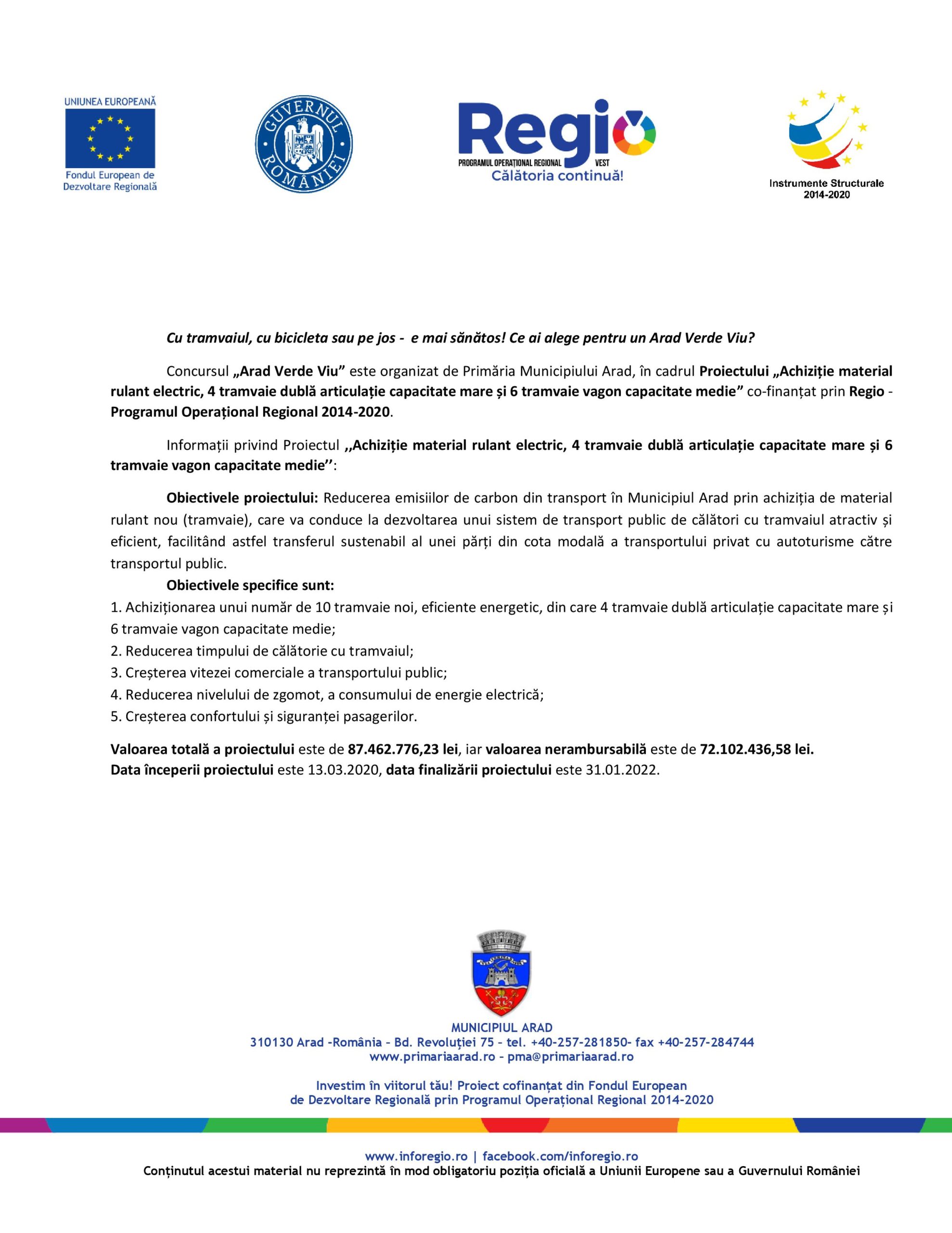 Concursul „Arad Verde Viu” este organizat de Primăria Municipiului Arad, în cadrul Proiectului „Achiziție material rulant electric, 4 tramvaie dublă articulație capacitate mare și 6 tramvaie vagon capacitate medie” co-finanțat prin Regio – Programul Operațional Regional 2014-2020.