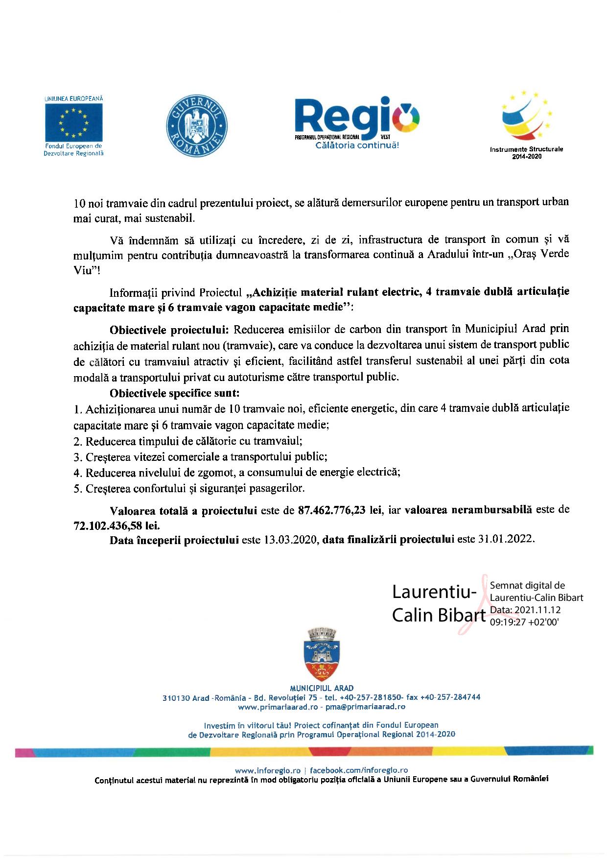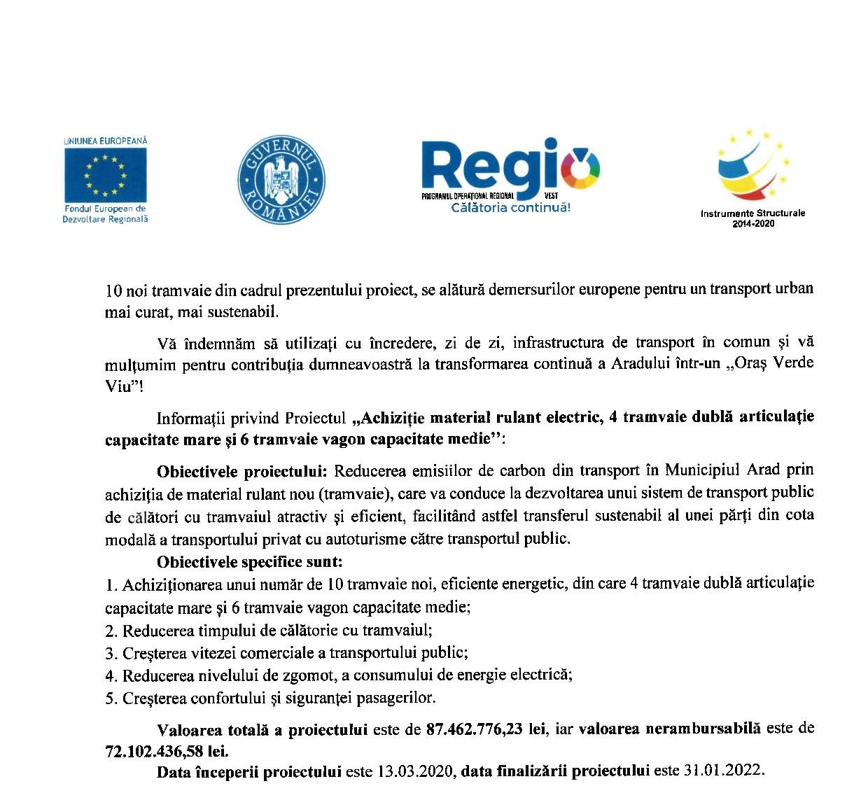 Informații privind Proiectul ,,Achiziție material rulant electric, 4 tramvaie dublă articulație capacitate mare și 6 tramvaie vagon capacitate medie’’: