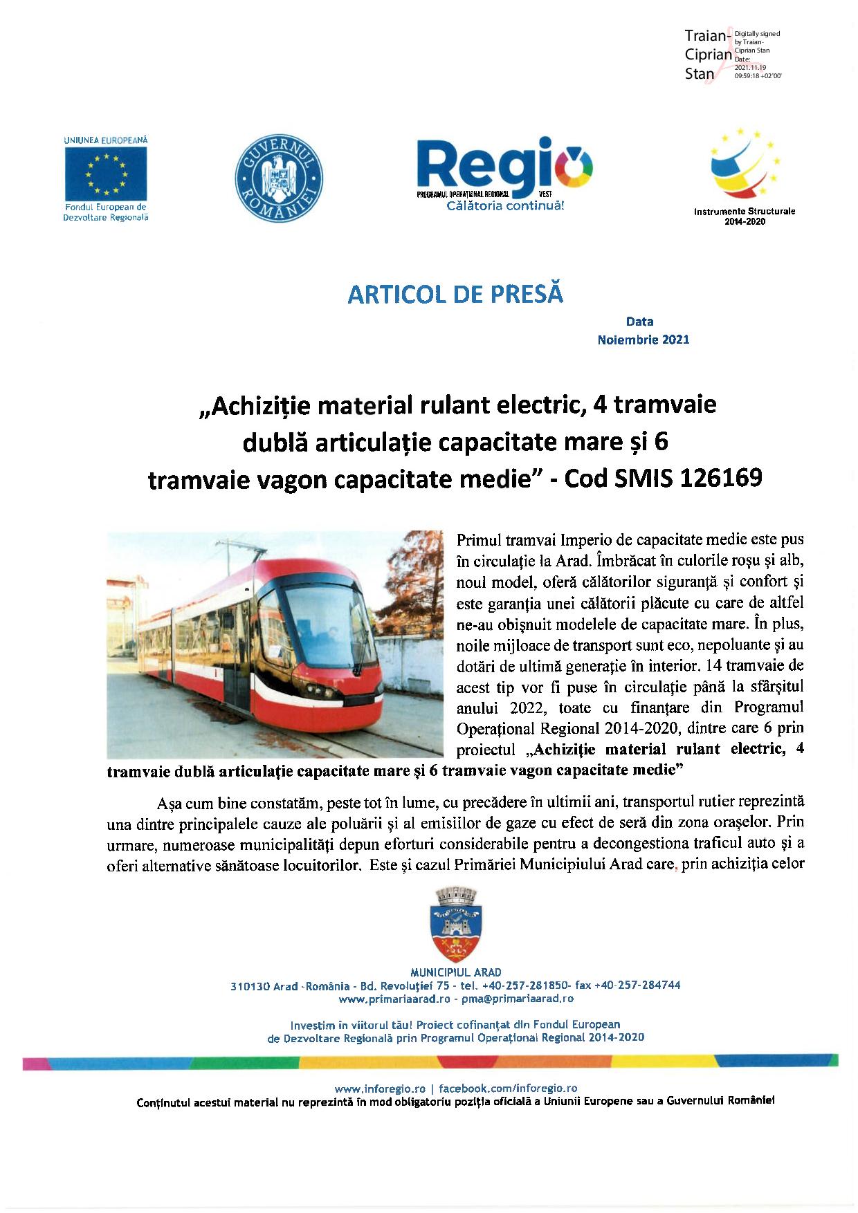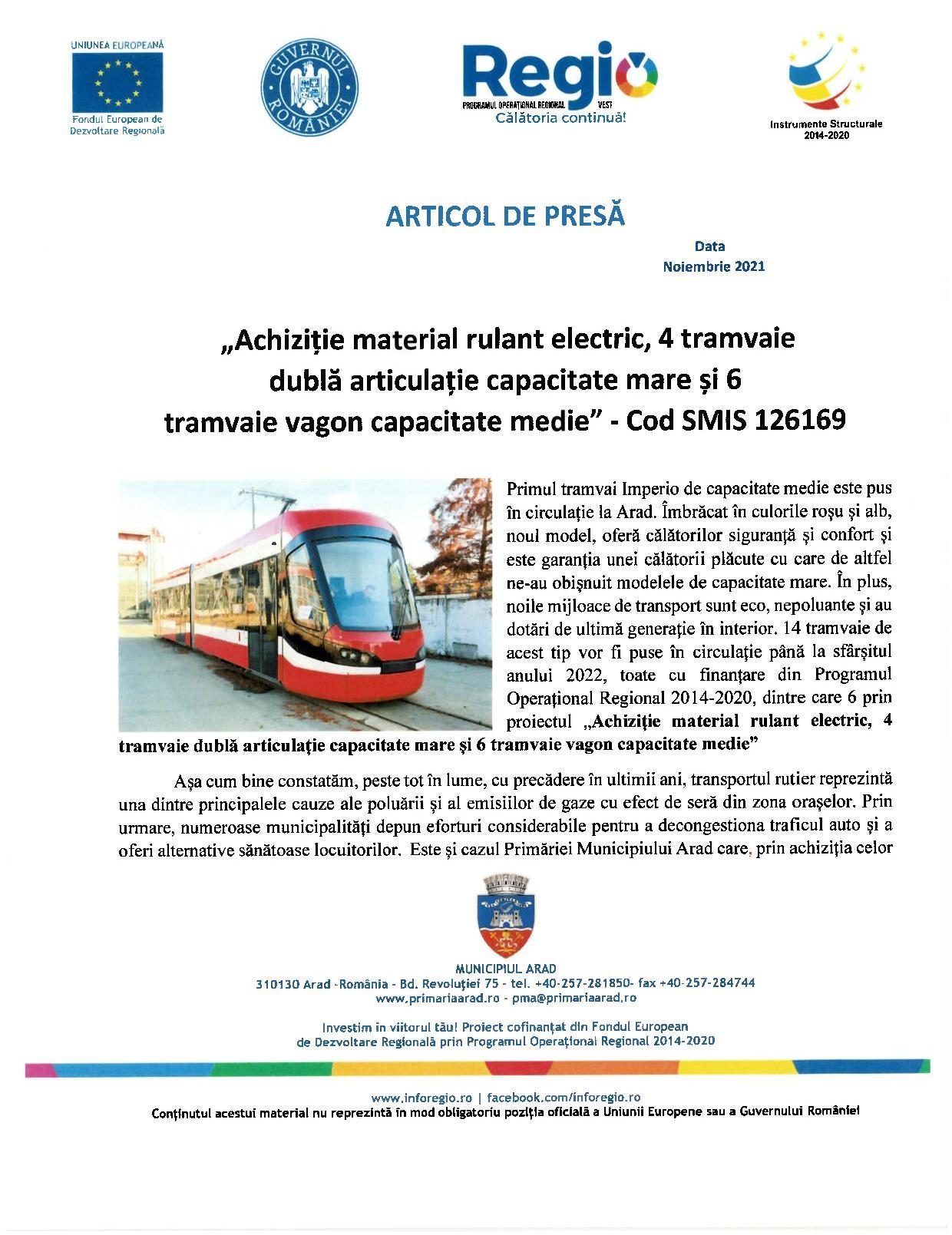 Primul tramvai Imperio de capacitate medie este pus în circulație la Arad. Îmbrăcat în culorile roșu și alb, noul model, oferă călătorilor siguranță și confort și este garanția unei călătorii plăcute cu care de altfel ne-au obișnuit modelele de capacitate mare. În plus, noile mijloace de transport sunt eco, nepoluante și au dotări de ultimă generație în interior. 14 tramvaie de acest tip vor fi puse în circulație până la sfârșitul anului 2022, toate cu finanțare din Programul Operațional Regional 2014-2020, dintre care 6 prin proiectul „Achiziție material rulant electric, 4 tramvaie dublă articulație capacitate mare și 6 tramvaie vagon capacitate medie”