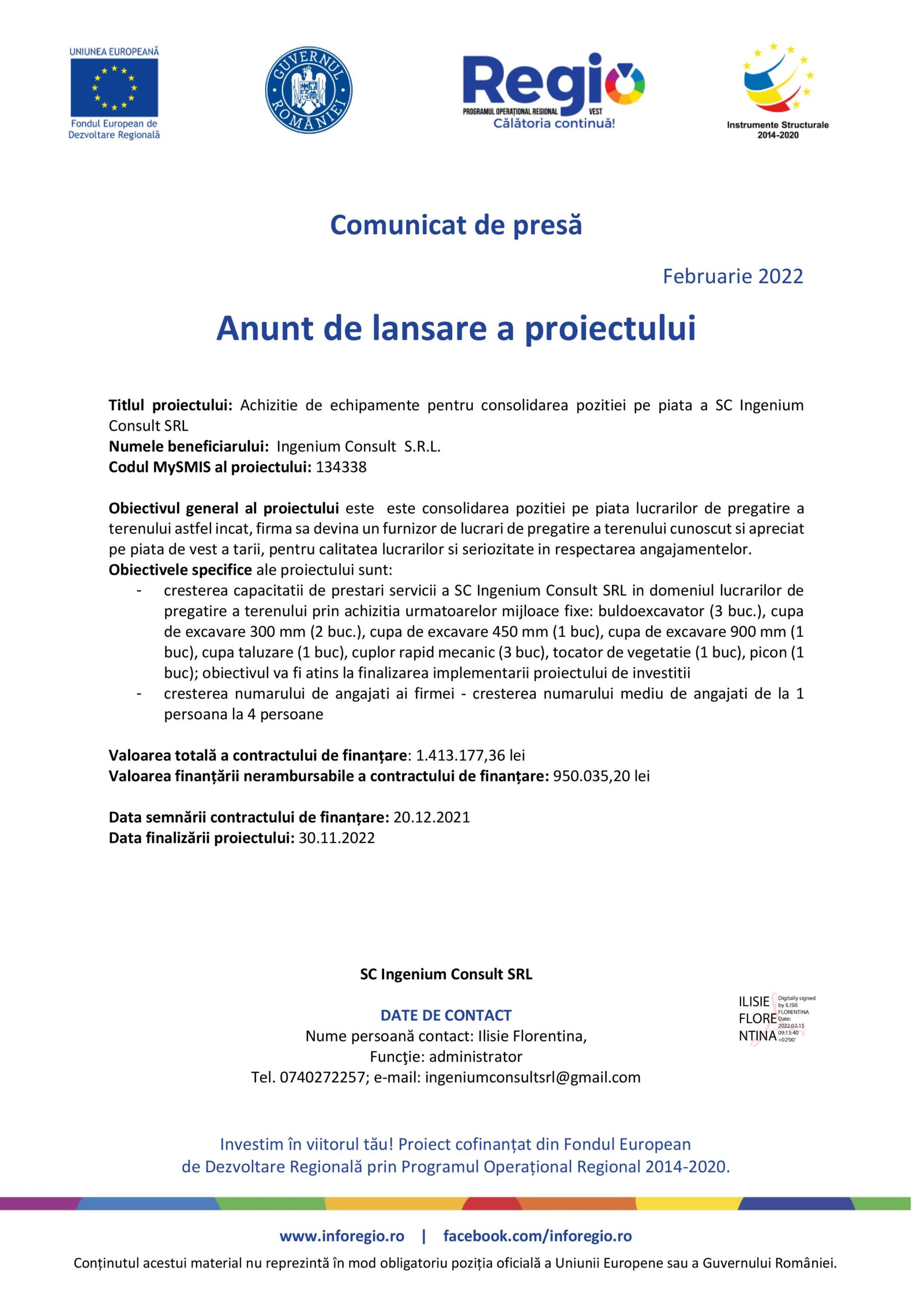 Titlul proiectului: Achizitie de echipamente pentru consolidarea pozitiei pe piata a SC Ingenium Consult SRL