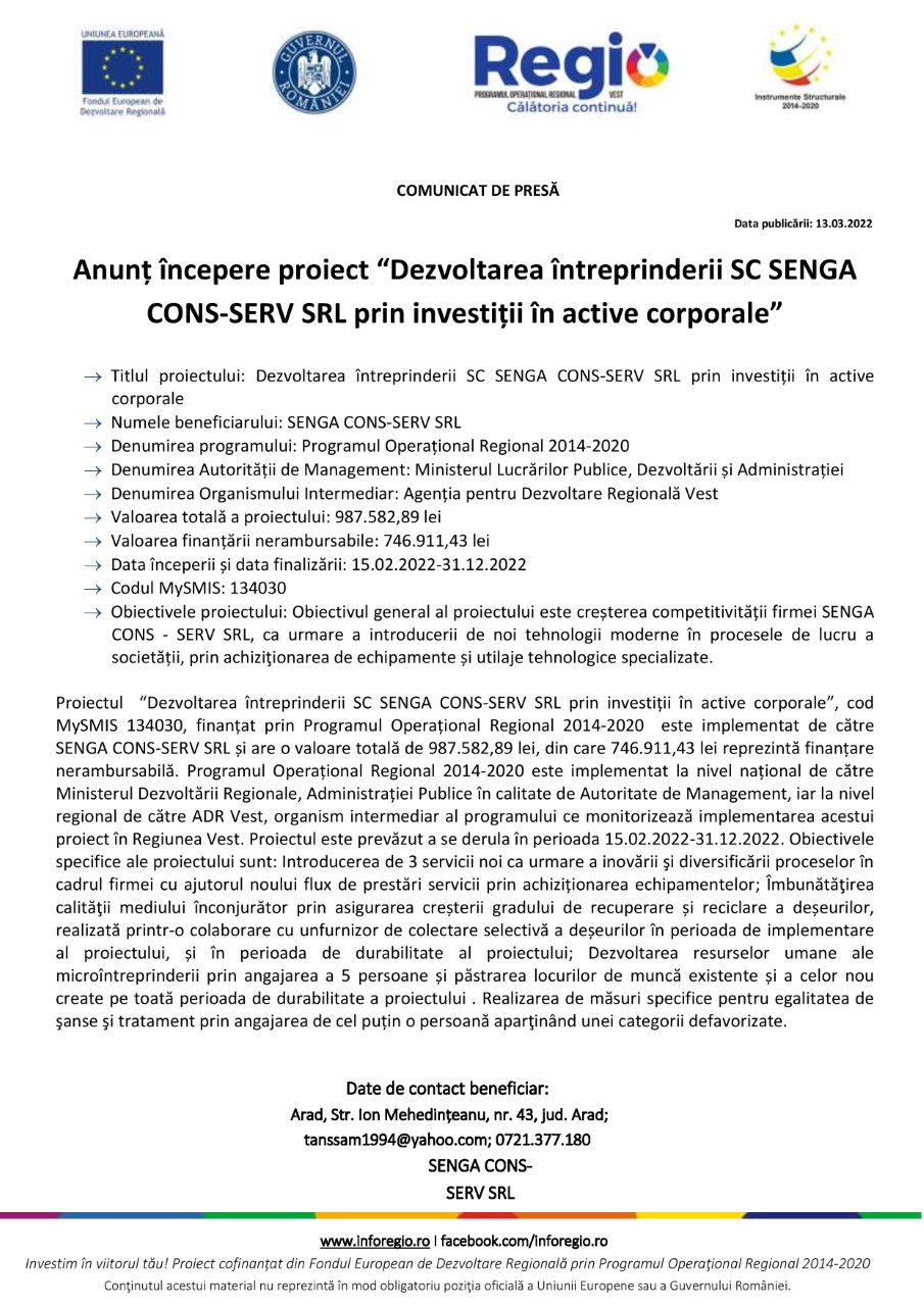 Proiectul “Dezvoltarea întreprinderii SC SENGA CONS-SERV SRL prin investiții în active corporale”, cod MySMIS 134030, finanțat prin Programul Operațional Regional 2014-2020 este implementat de către SENGA CONS-SERV SRL și are o valoare totală de 987.582,89 lei, din care 746.911,43 lei reprezintă finanțare nerambursabilă. Programul Operațional Regional 2014-2020 este implementat la nivel național de către Ministerul Dezvoltării Regionale, Administrației Publice în calitate de Autoritate de Management, iar la nivel regional de către ADR Vest, organism intermediar al programului ce monitorizează implementarea acestui proiect în Regiunea Vest. Proiectul este prevăzut a se derula în perioada 15.02.2022-31.12.2022. Obiectivele specifice ale proiectului sunt: Introducerea de 3 servicii noi ca urmare a inovării şi diversificării proceselor în cadrul firmei cu ajutorul noului flux de prestări servicii prin achiziționarea echipamentelor; Îmbunătăţirea calităţii mediului înconjurător prin asigurarea creșterii gradului de recuperare și reciclare a deșeurilor, realizată printr-o colaborare cu unfurnizor de colectare selectivă a deșeurilor în perioada de implementare al proiectului, și în perioada de durabilitate al proiectului; Dezvoltarea resurselor umane ale microîntreprinderii prin angajarea a 5 persoane și păstrarea locurilor de muncă existente și a celor nou create pe toată perioada de durabilitate a proiectului . Realizarea de măsuri specifice pentru egalitatea de şanse şi tratament prin angajarea de cel puțin o persoană aparţinând unei categorii defavorizate.