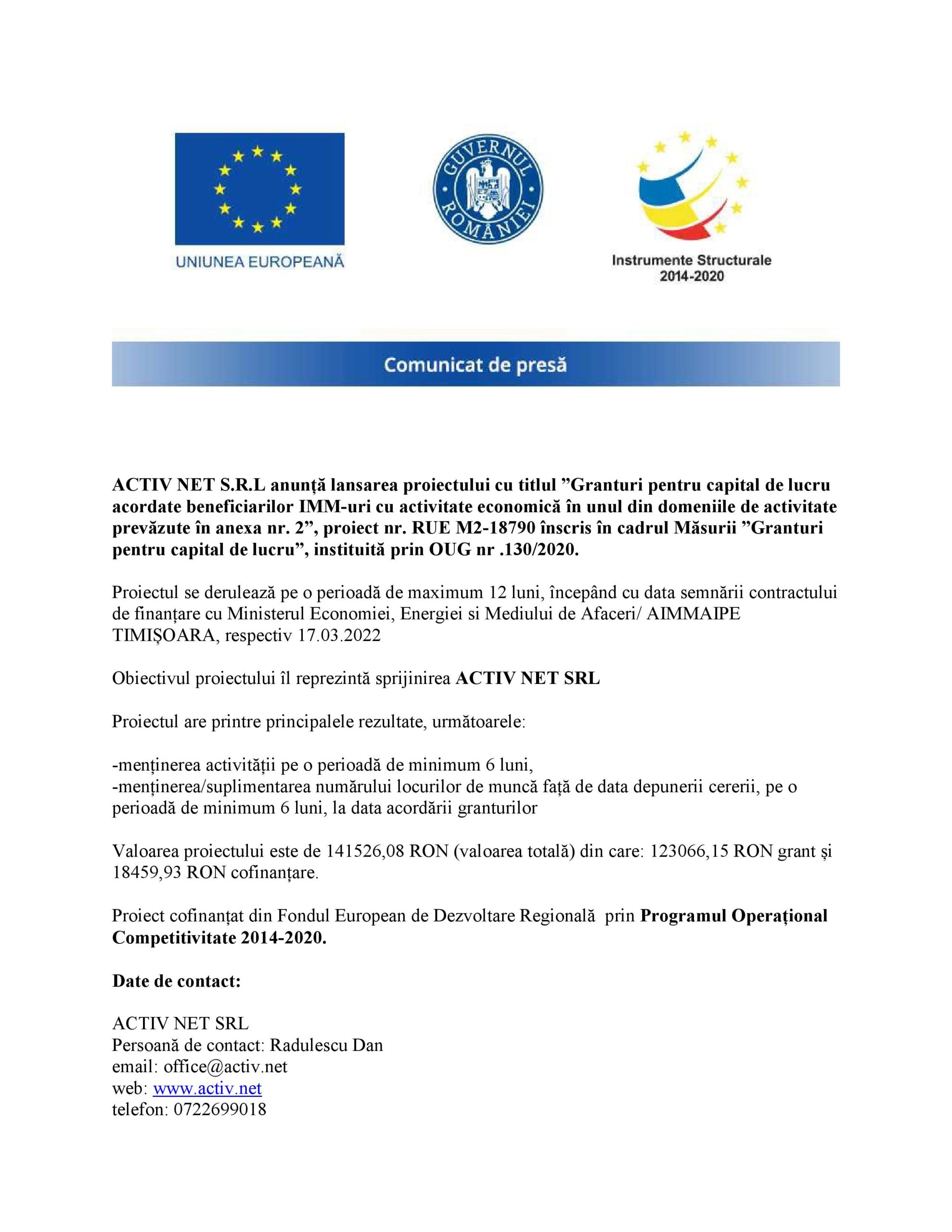 Obiectivul proiectului îl reprezintă sprijinirea ACTIV NET SRL