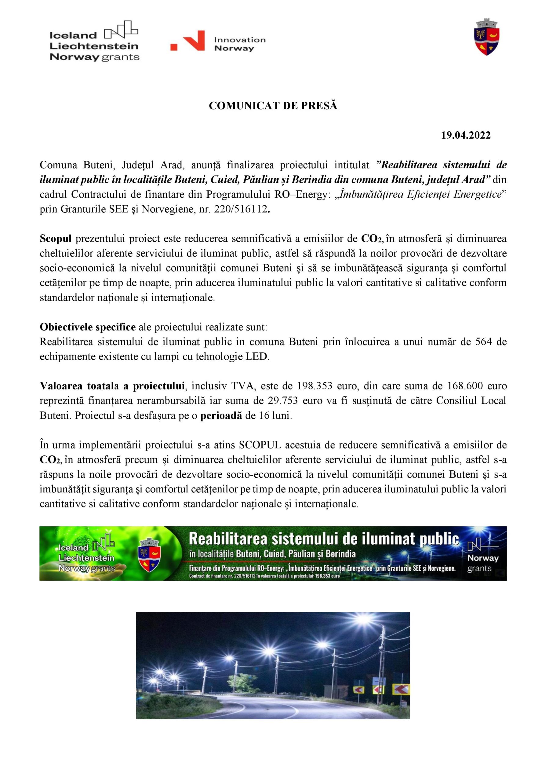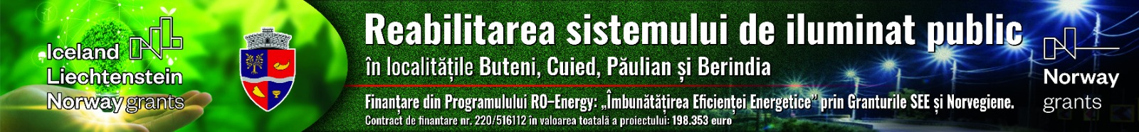 Reabilitarea sistemului de iluminat public in comuna Buteni prin înlocuirea a unui număr de 564 de echipamente existente cu lampi cu tehnologie LED.