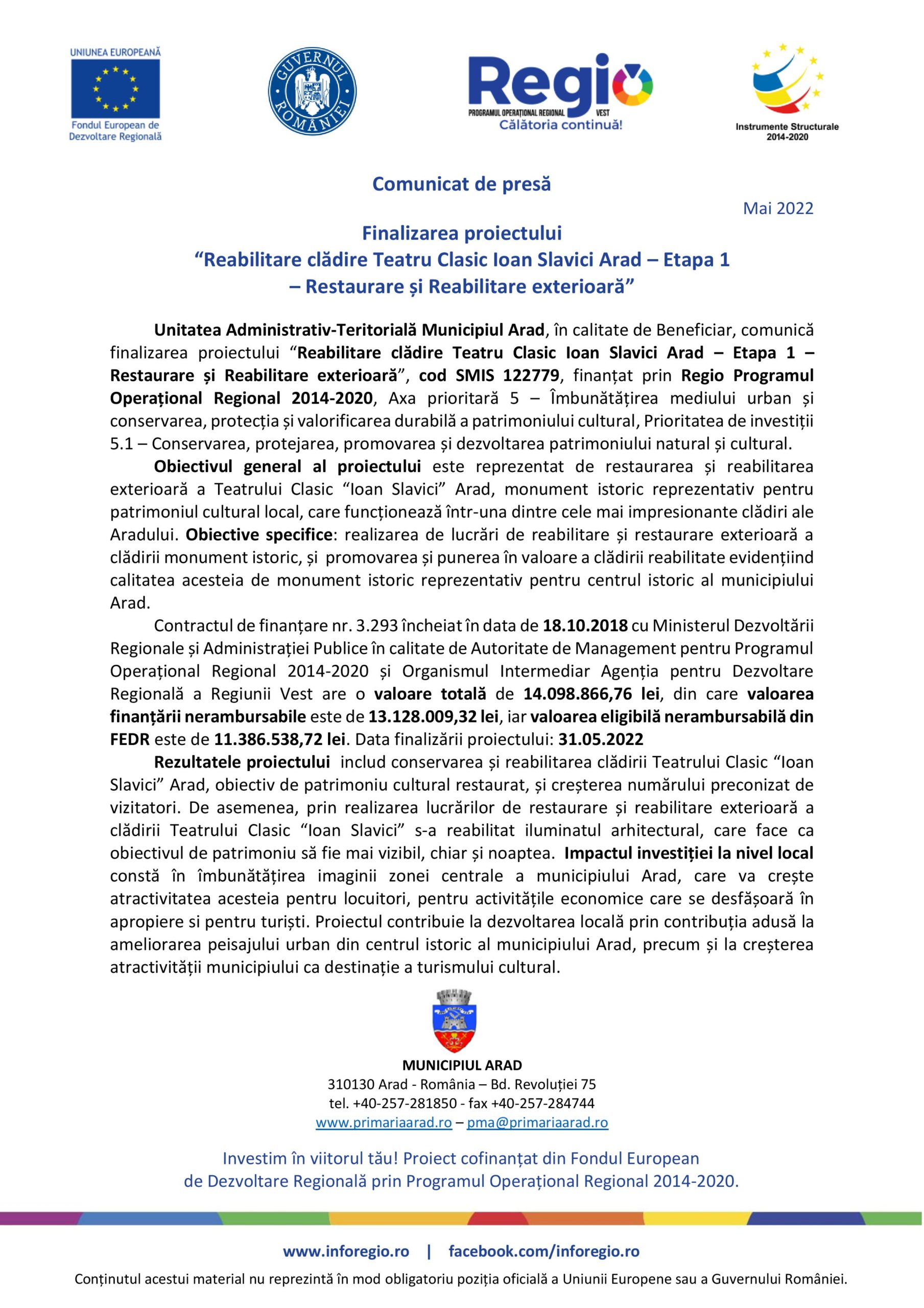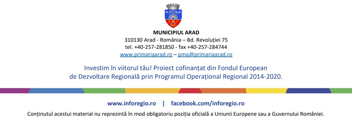 Unitatea Administrativ-Teritorială Municipiul Arad, în calitate de Beneficiar, comunică finalizarea proiectului “Reabilitare clădire Teatru Clasic Ioan Slavici Arad – Etapa 1 – Restaurare și Reabilitare exterioară”, cod SMIS 122779, finanțat prin Regio Programul Operațional Regional 2014-2020, Axa prioritară 5 – Îmbunătățirea mediului urban și conservarea, protecția și valorificarea durabilă a patrimoniului cultural, Prioritatea de investiții 5.1 – Conservarea, protejarea, promovarea și dezvoltarea patrimoniului natural și cultural.
