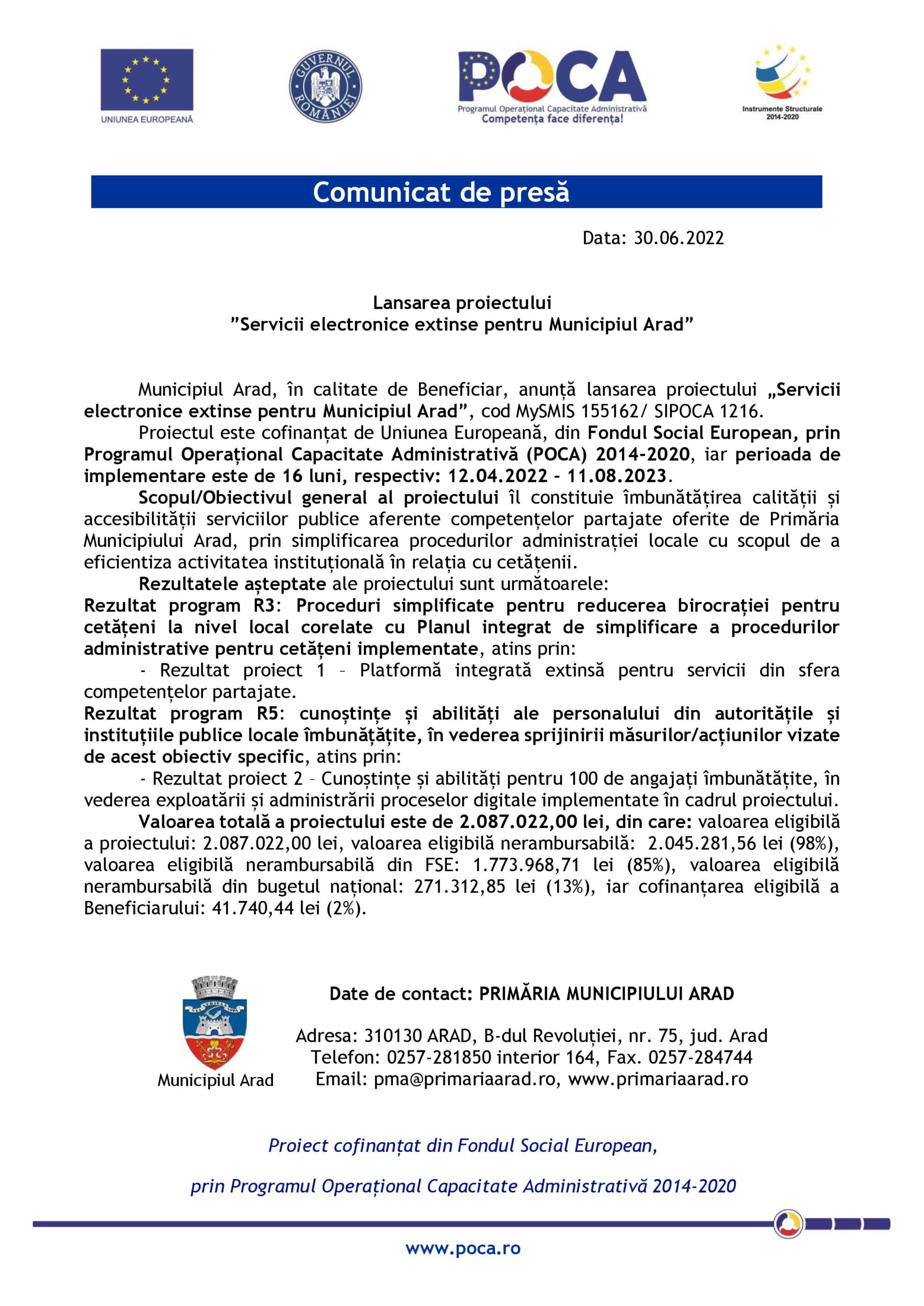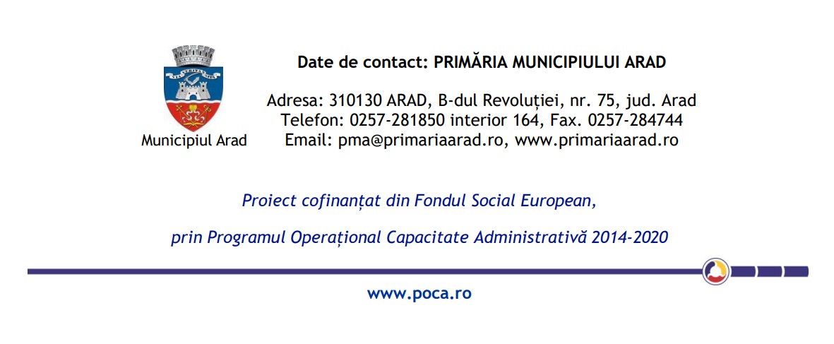 Municipiul Arad, în calitate de Beneficiar, anunță lansarea proiectului „Servicii electronice extinse pentru Municipiul Arad”, cod MySMIS 155162/ SIPOCA 1216.