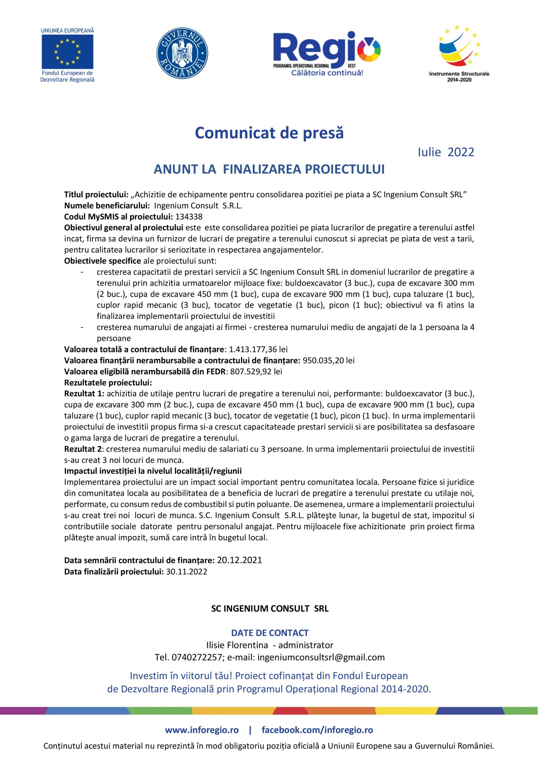 Tel. 0740272257; e-mail: ingeniumconsultsrl@gmail.com