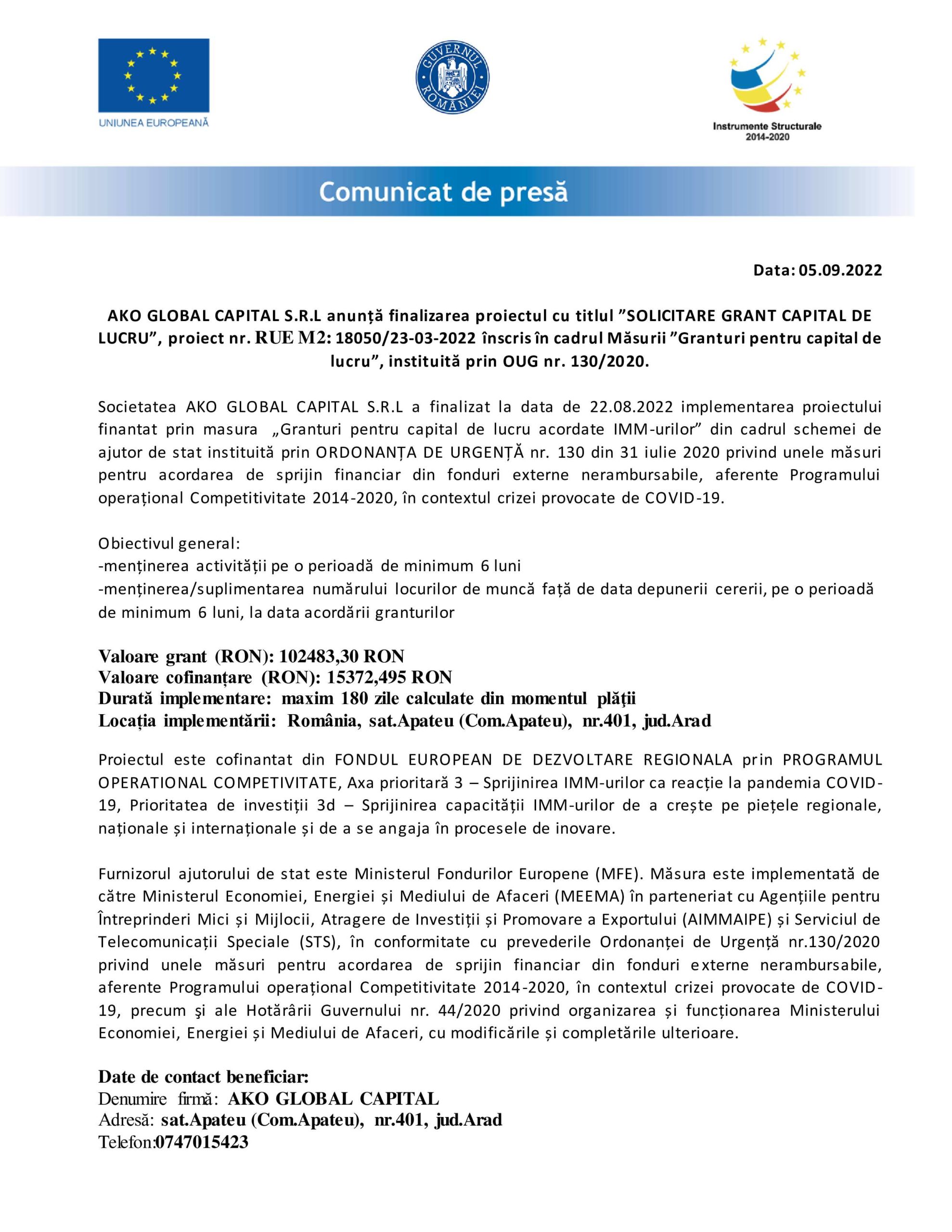 Societatea AKO GLOBAL CAPITAL S.R.L a finalizat la data de 22.08.2022 implementarea proiectului finantat prin masura „Granturi pentru capital de lucru acordate IMM-urilor” din cadrul schemei de ajutor de stat instituită prin ORDONANȚA DE URGENȚĂ nr. 130 din 31 iulie 2020 privind unele măsuri pentru acordarea de sprijin financiar din fonduri externe nerambursabile, aferente Programului operațional Competitivitate 2014-2020, în contextul crizei provocate de COVID-19.