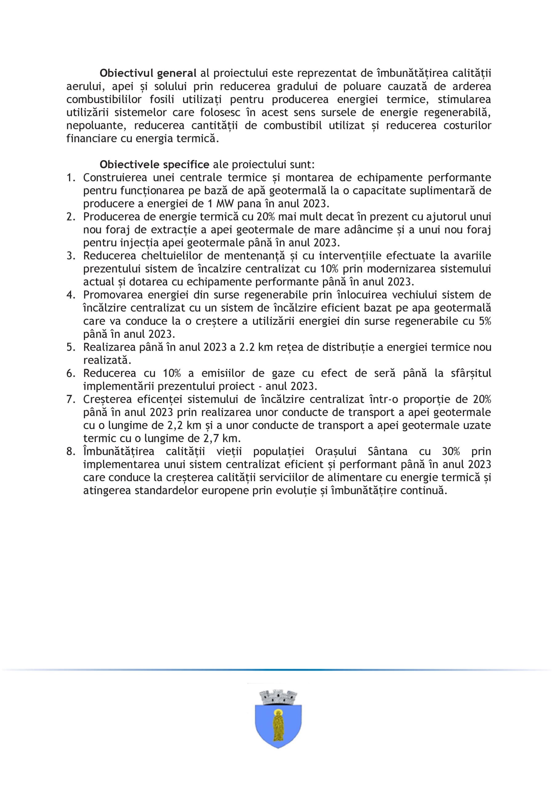 Obiectivul general al proiectului este reprezentat de îmbunătățirea calității aerului, apei și solului prin reducerea gradului de poluare cauzată de arderea combustibililor fosili utilizați pentru producerea energiei termice, stimularea utilizării sistemelor care folosesc în acest sens sursele de energie regenerabilă, nepoluante, reducerea cantității de combustibil utilizat și reducerea costurilor financiare cu energia termică.