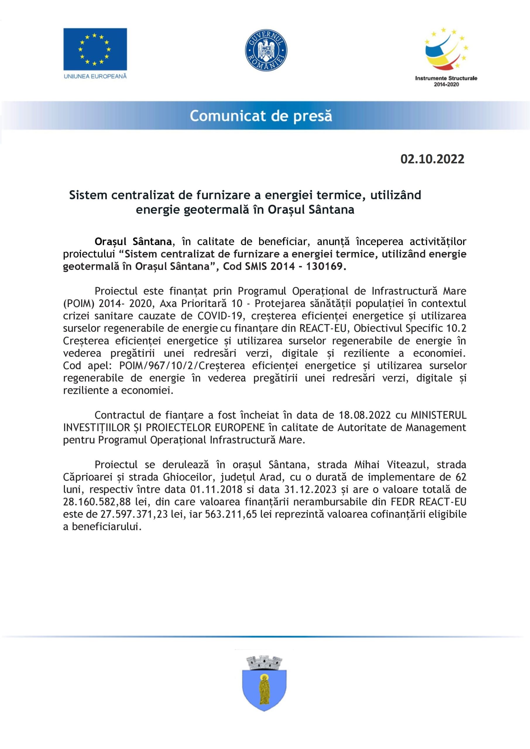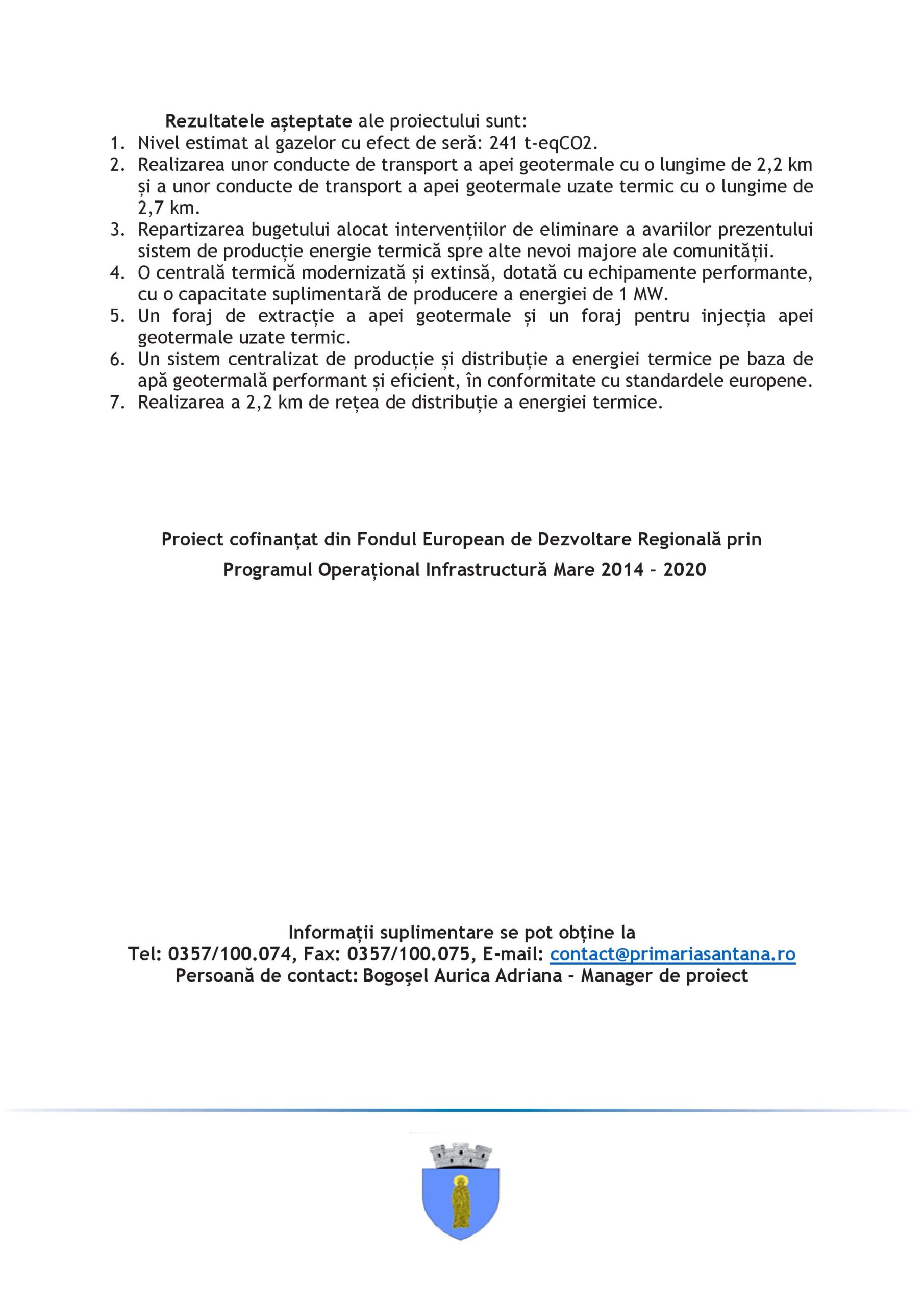 Orașul Sântana, în calitate de beneficiar, anunță începerea activităților proiectului “Sistem centralizat de furnizare a energiei termice, utilizând energie geotermală în Orașul Sântana”, Cod SMIS 2014 – 130169.